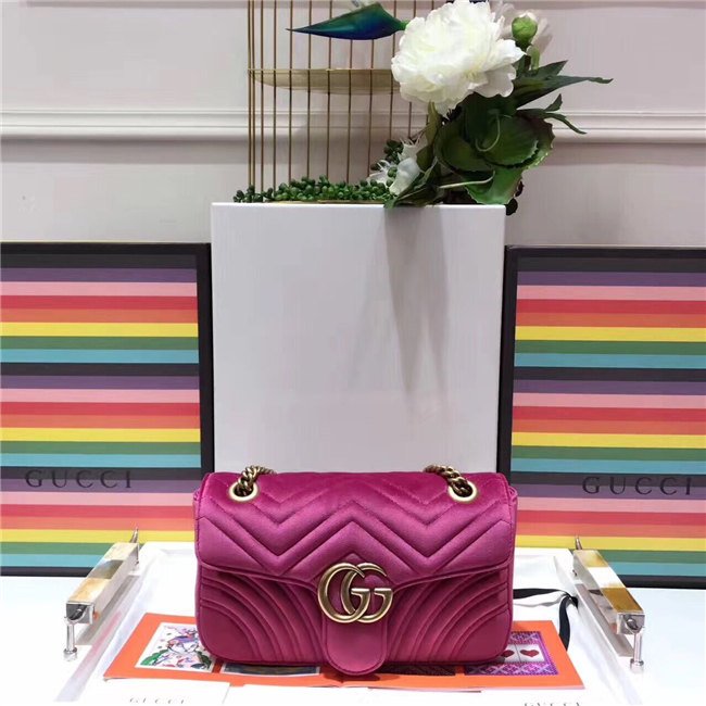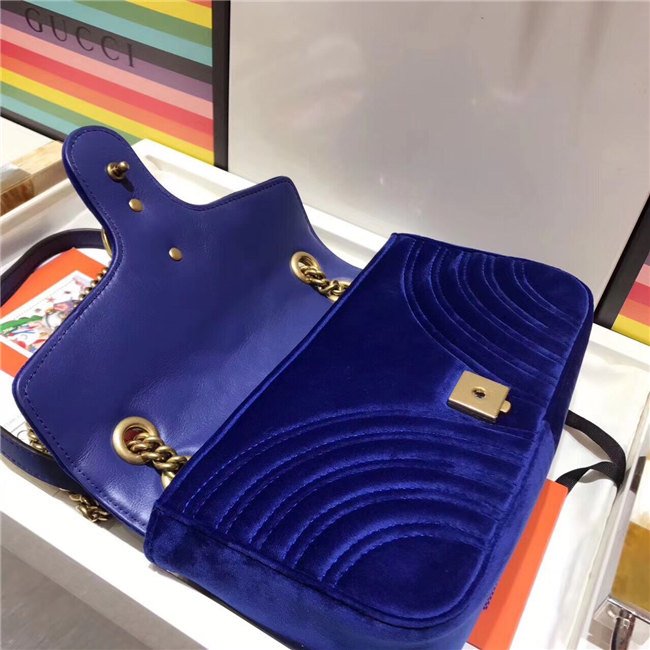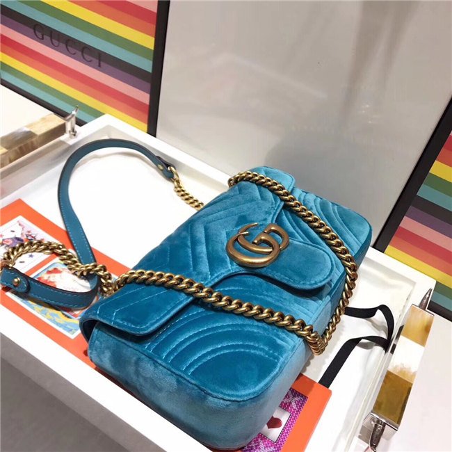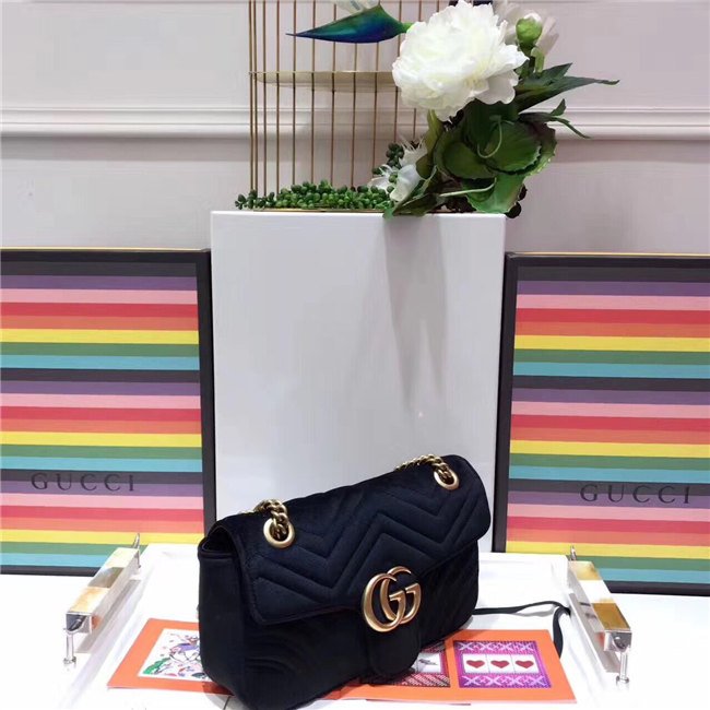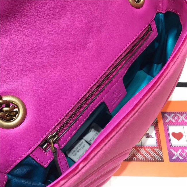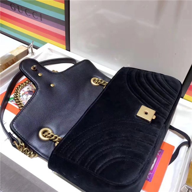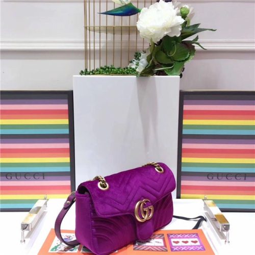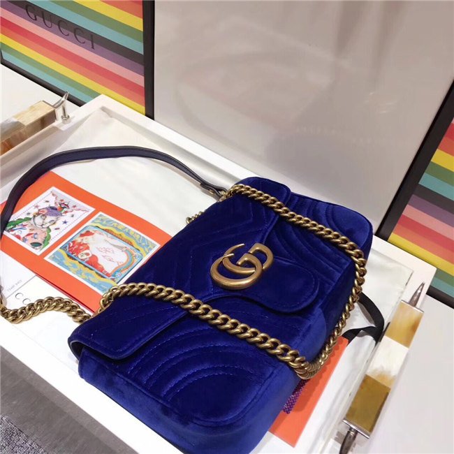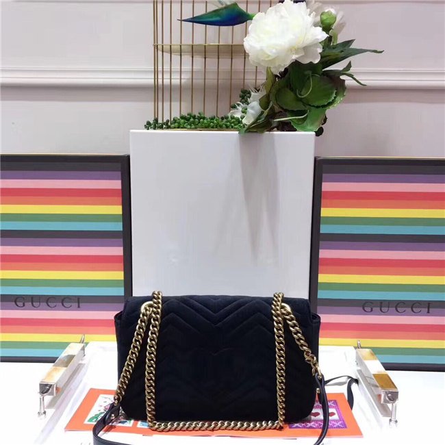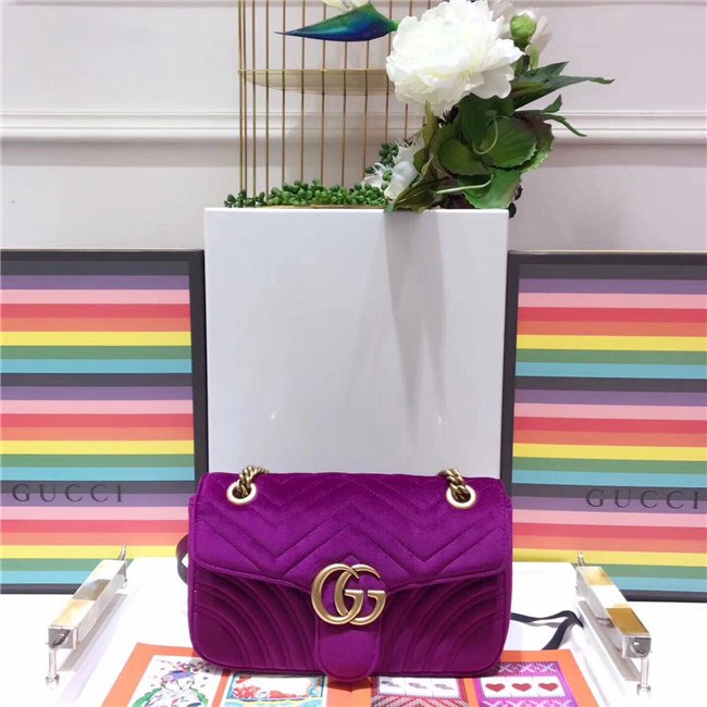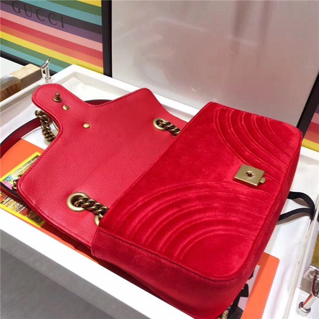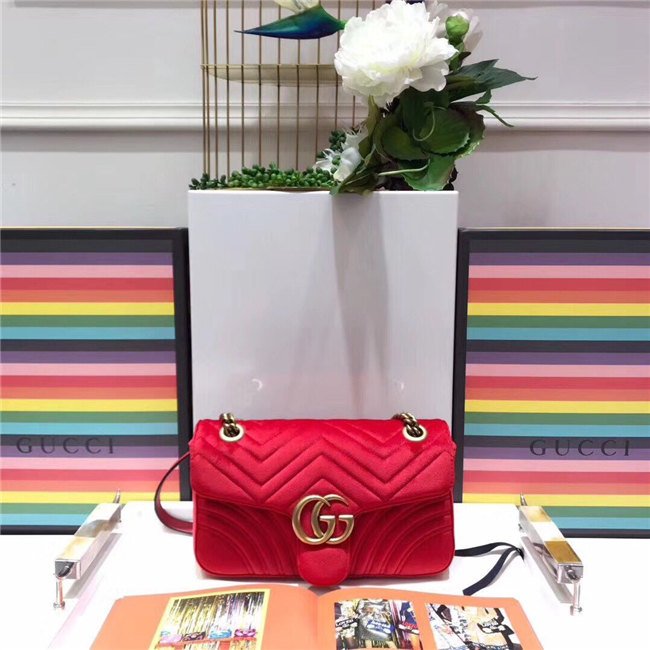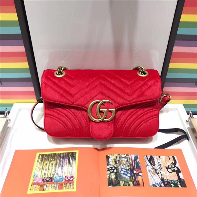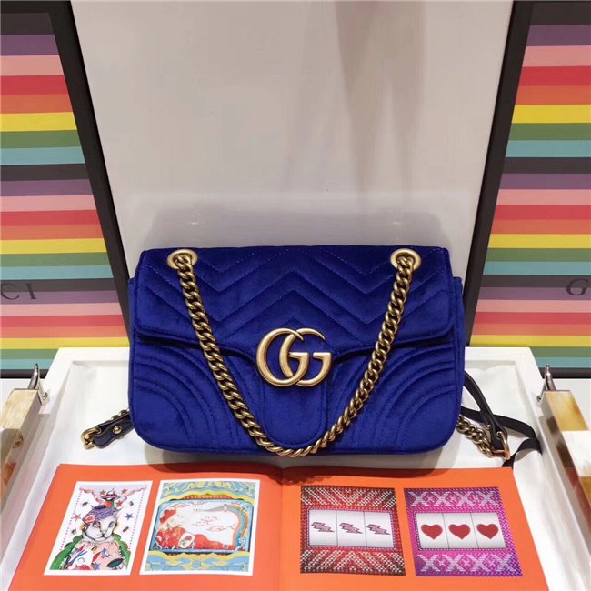 The small GG Marmont chain shoulder bag has a softly structured shape and an oversized flap closure with Double G hardware. The sliding chain strap can be worn multiple ways, changing between a shoulder and a top handle bag. Made in embroidered chevron velvet with a heart on the back.