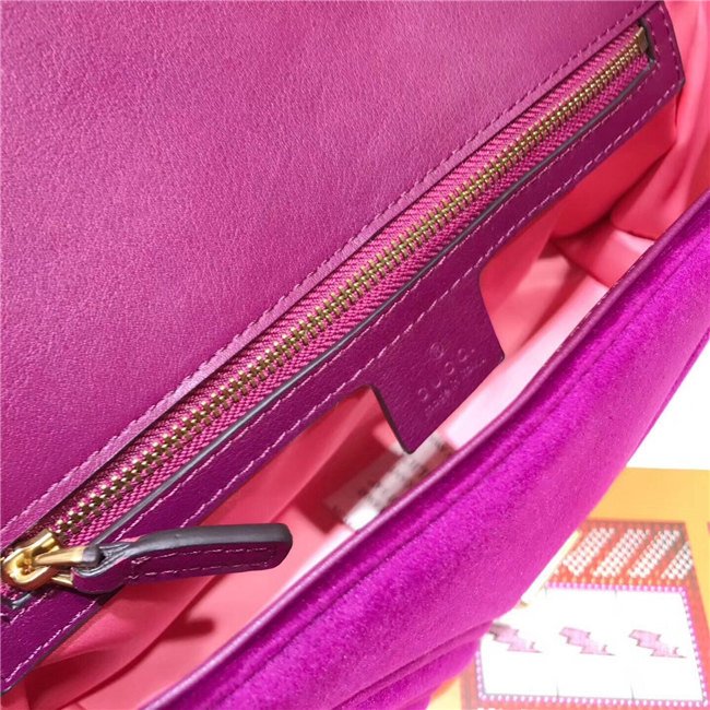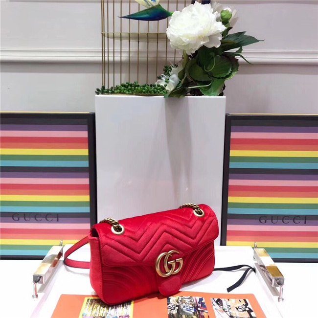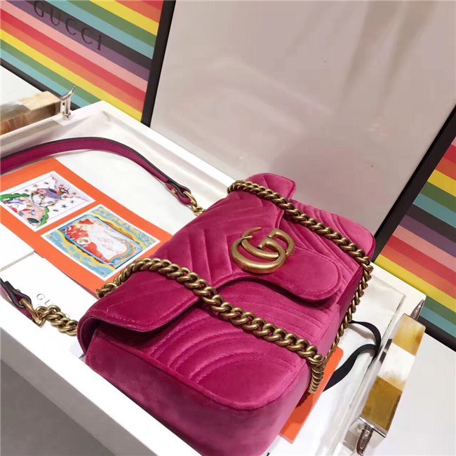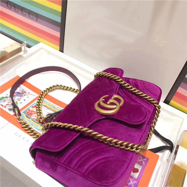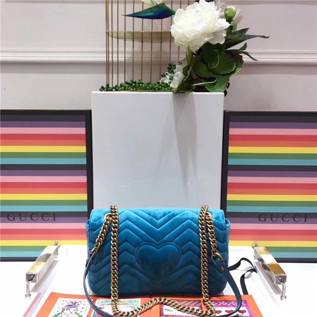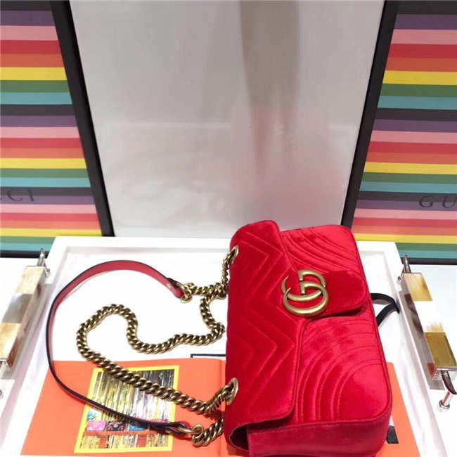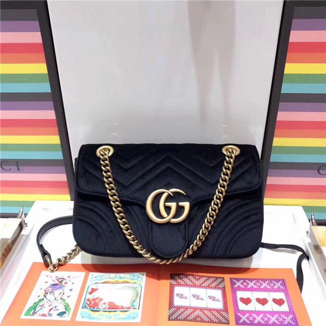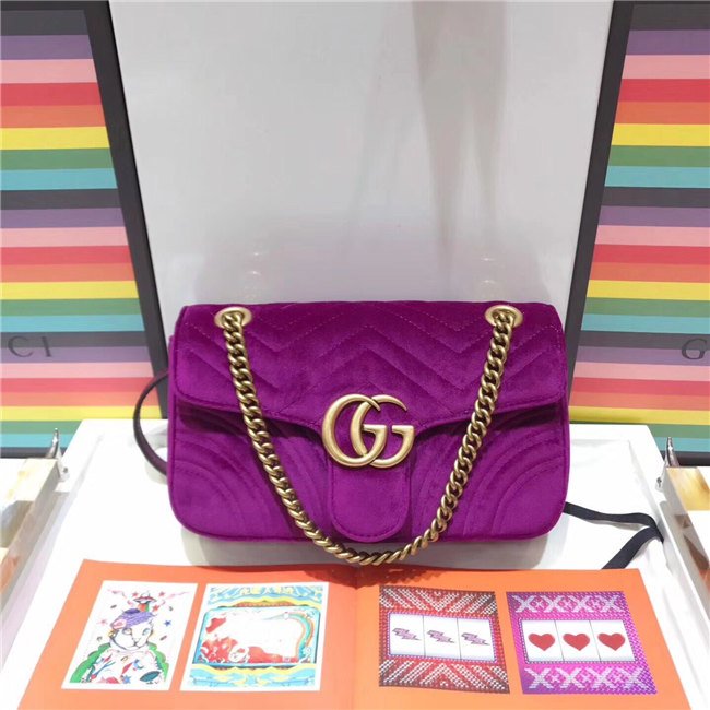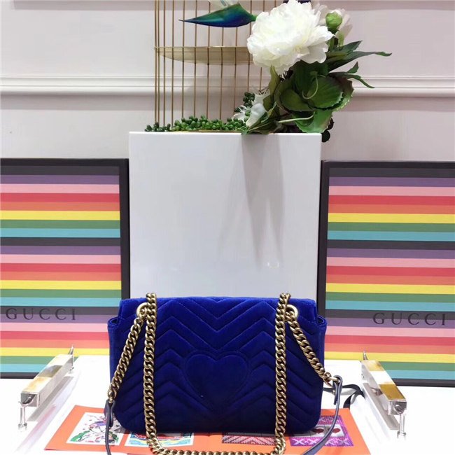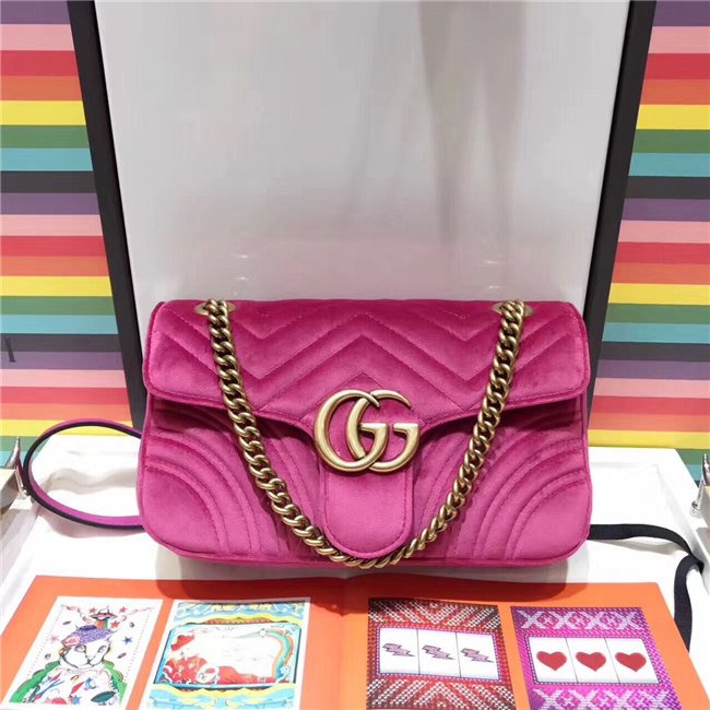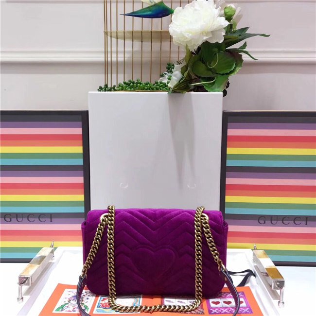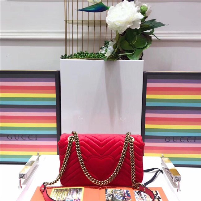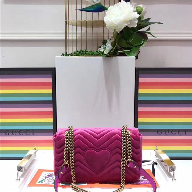 The small GG Marmont chain shoulder bag has a softly structured shape and an oversized flap closure with Double G hardware. The sliding chain strap can be worn multiple ways, changing between a shoulder and a top handle bag. Made in embroidered chevron velvet with a heart on the back.