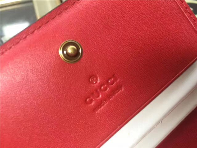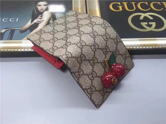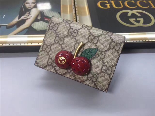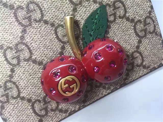 A three-dimensional cherry accessory with encrusted crystals stands out against the GG background for a playful touch. GG Supreme canvas, a material with low environmental impact, with hibiscus red leather trim Cherries accessory with encrusted crystals.