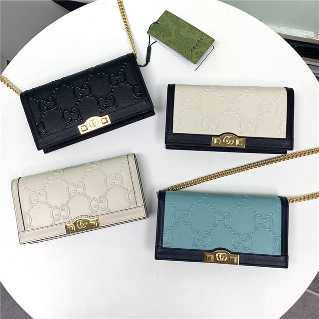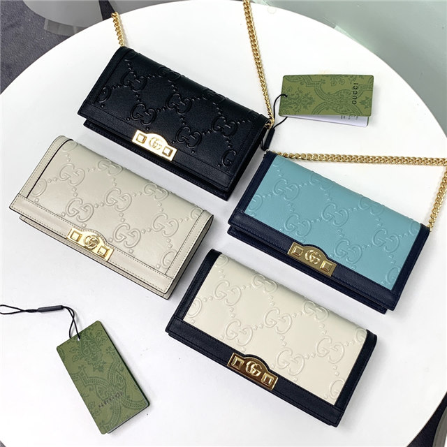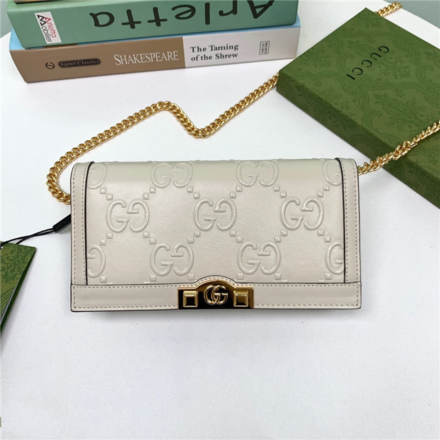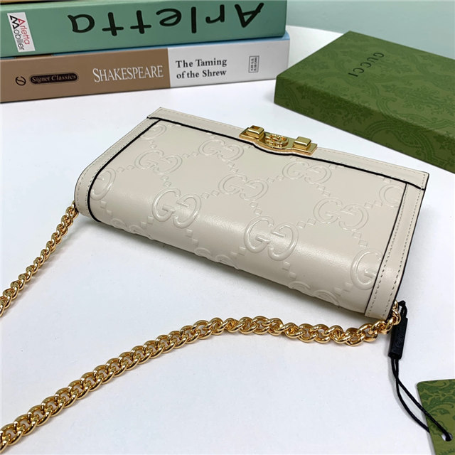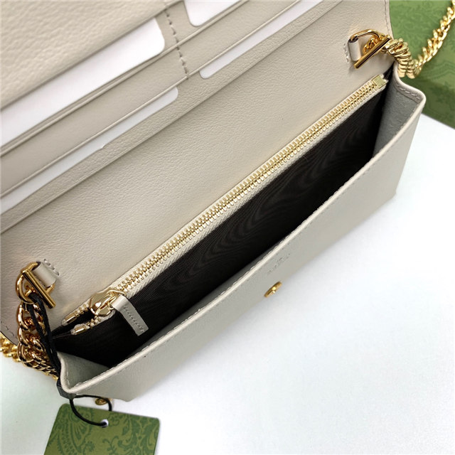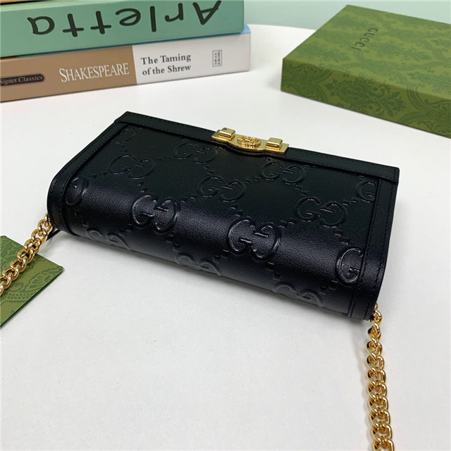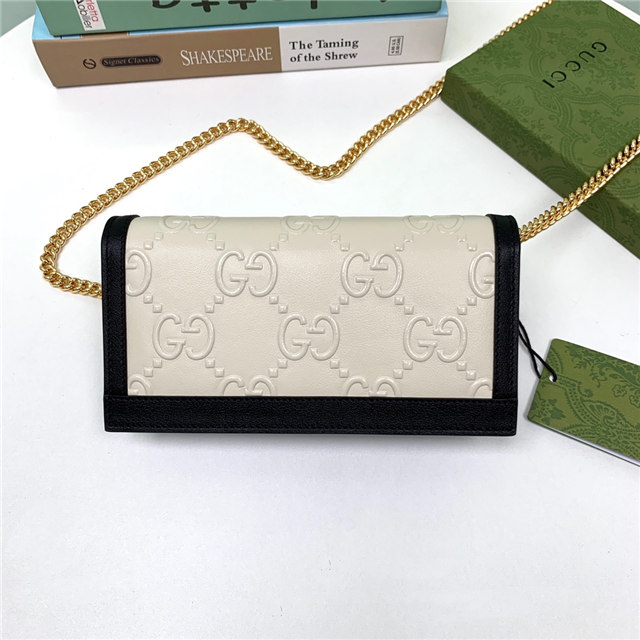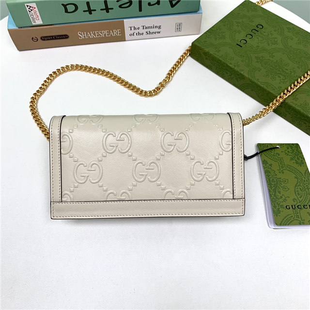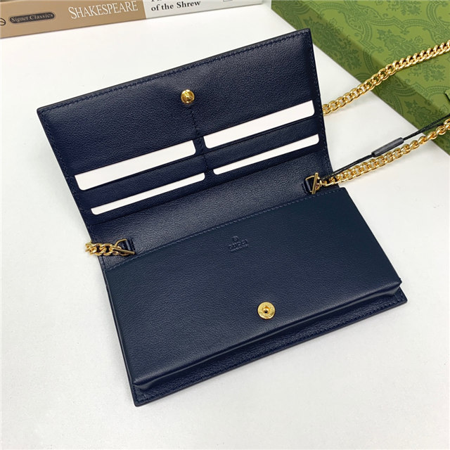 Contemporary House codes from the last six years are paired with modern design details. Here, the emblematic GG motif is paired with studs, adding a contemporary twist to this vintage-inspired style. The embossed motif defines this light blue leather chain wallet.