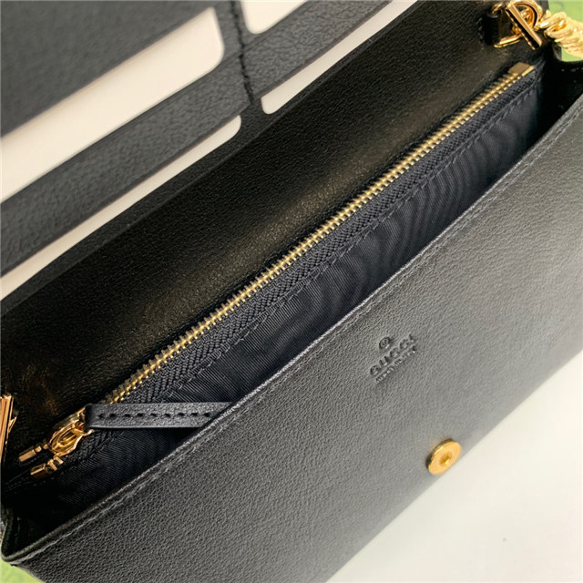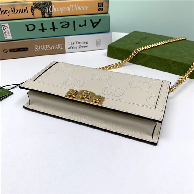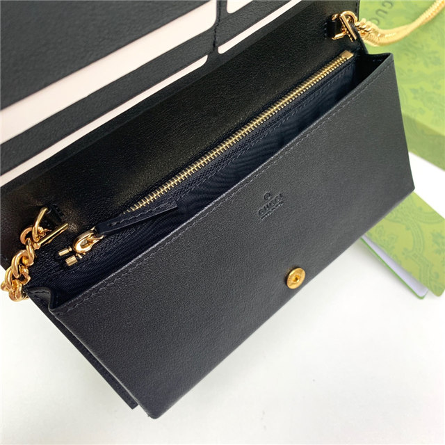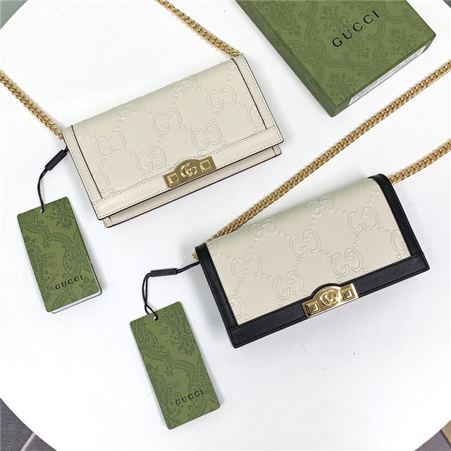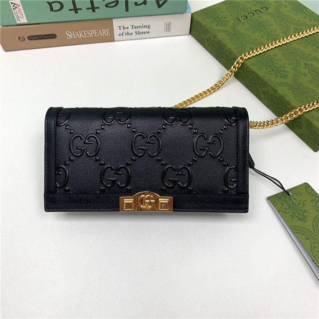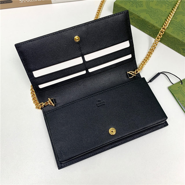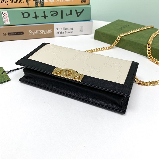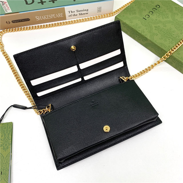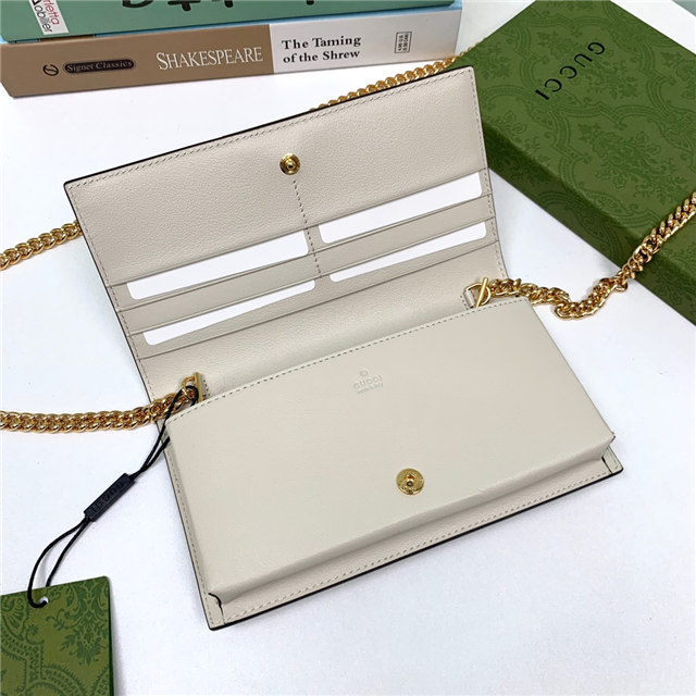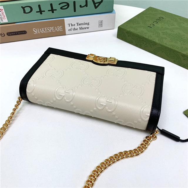 Contemporary House codes from the last six years are paired with modern design details. Here, the emblematic GG motif is paired with studs, adding a contemporary twist to this vintage-inspired style. The embossed motif defines this light blue leather chain wallet.