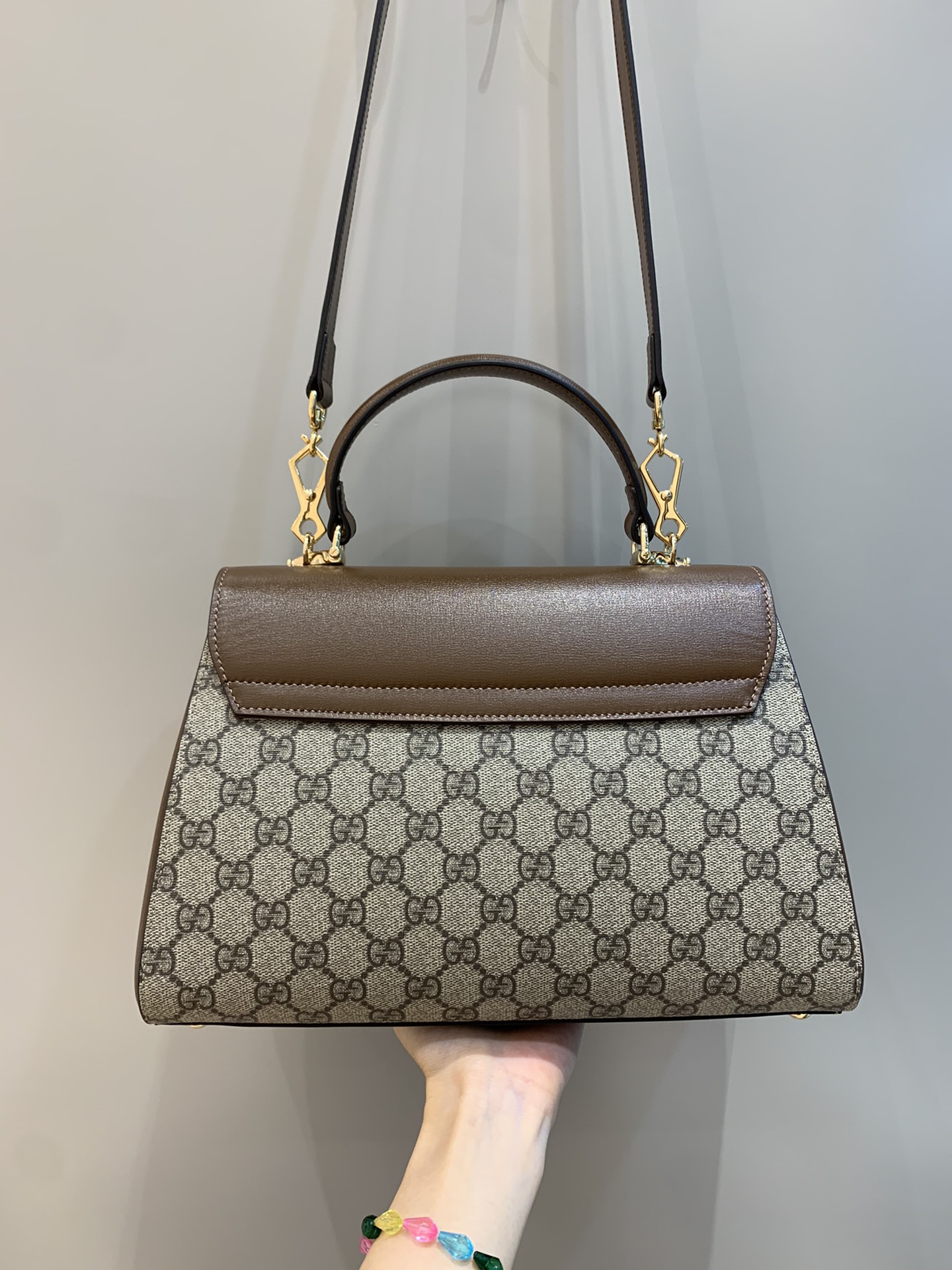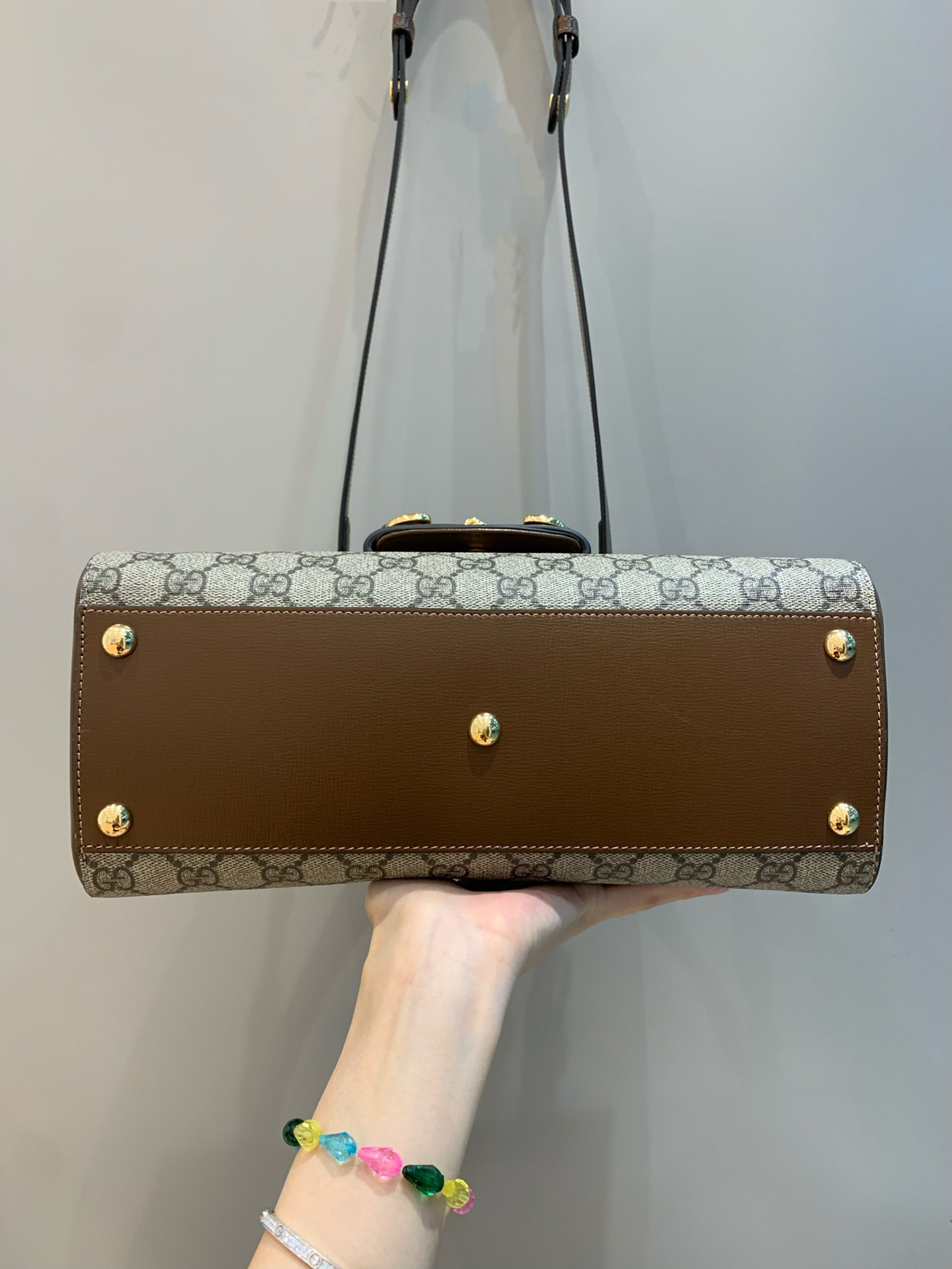 - Shiny gold-toned hardware