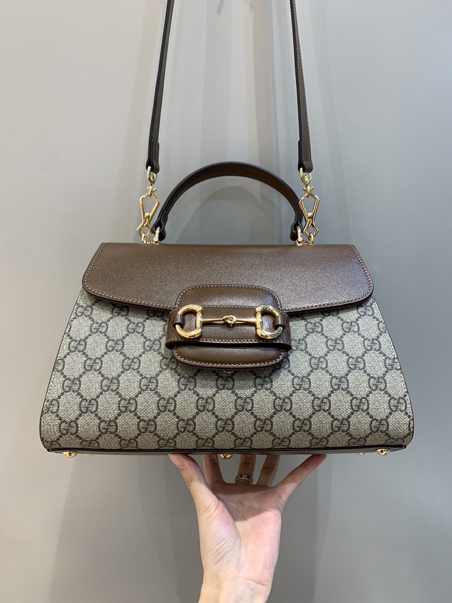 The Gucci Horsebit 1955 is introduced in beige and ebony GG Supreme canvas and a medium size. The collection unifies details first introduced on the original bag that inspired the line from over six decades ago with a modern spirit, highlighting the Horsebit. Part of Gucci’s genetic code, the double ring and bar design has been established as one of the most distinctive elements among the House symbols borrowed from the equestrian world. A brown leather trim completes the style with an elevated feel.
