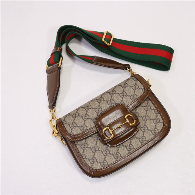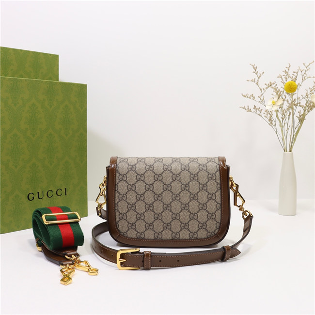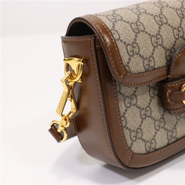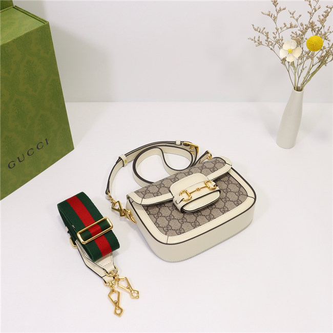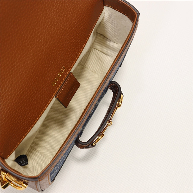 A cult fabric, denim is reimagined through the Gucci lens with the House”s GG motif. The logo infused fabric is paired with the Gucci Horsebit 1955”s recognizable Horsebit hardware. The mini style is completed by a detachable Web shoulder strap in blue and red, adding a versatile feel to the design.