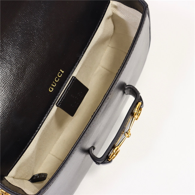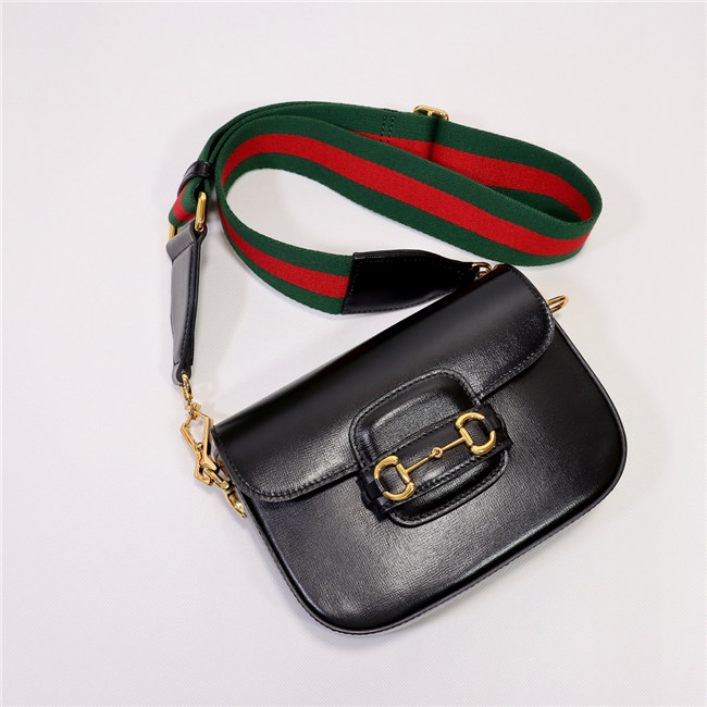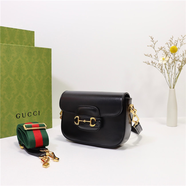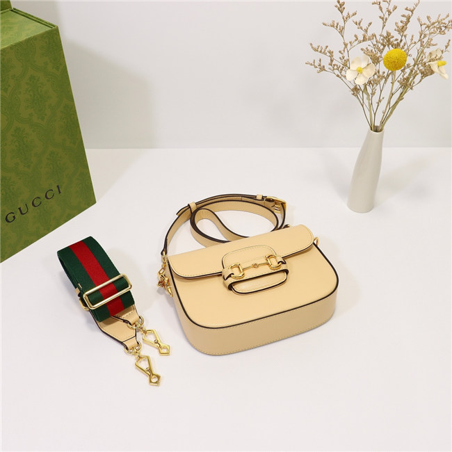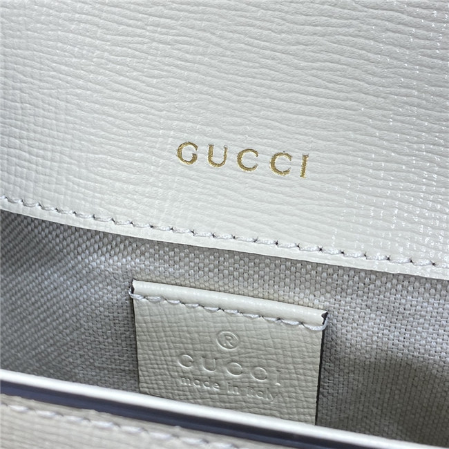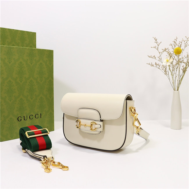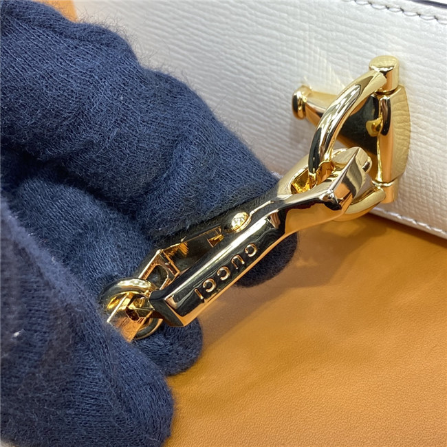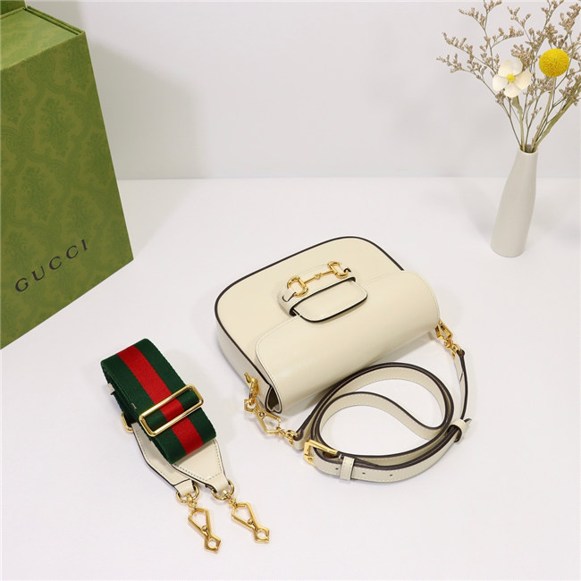 Petite versions of the Gucci Horsebit 1955 add a hybrid twist to the vintage inspired line. Enriched with two different shoulder straps, the white leather mini bag’s character transforms from understated elegance with a tonal leather strap to a strong logo feel thanks to a red and green Web option.