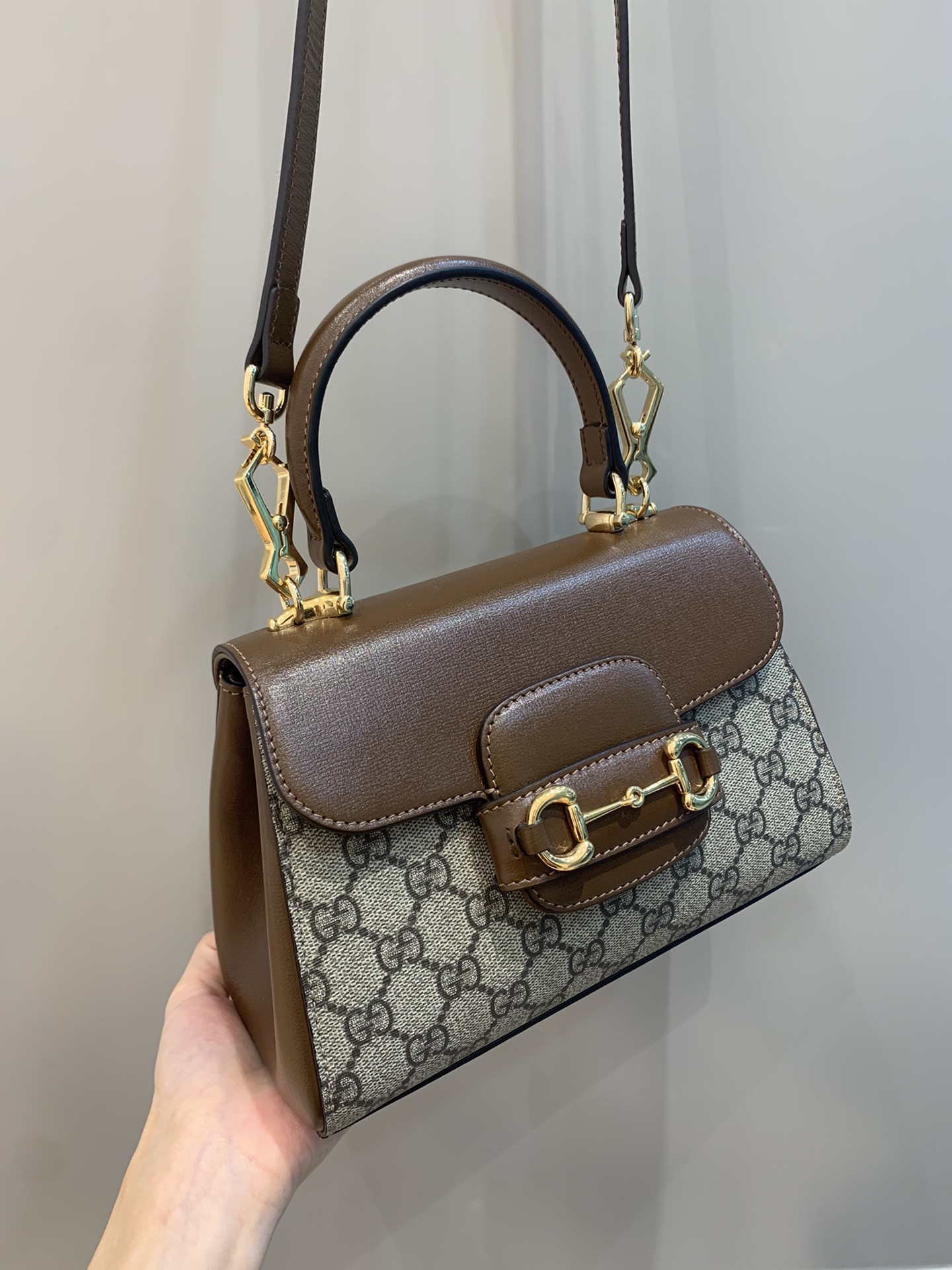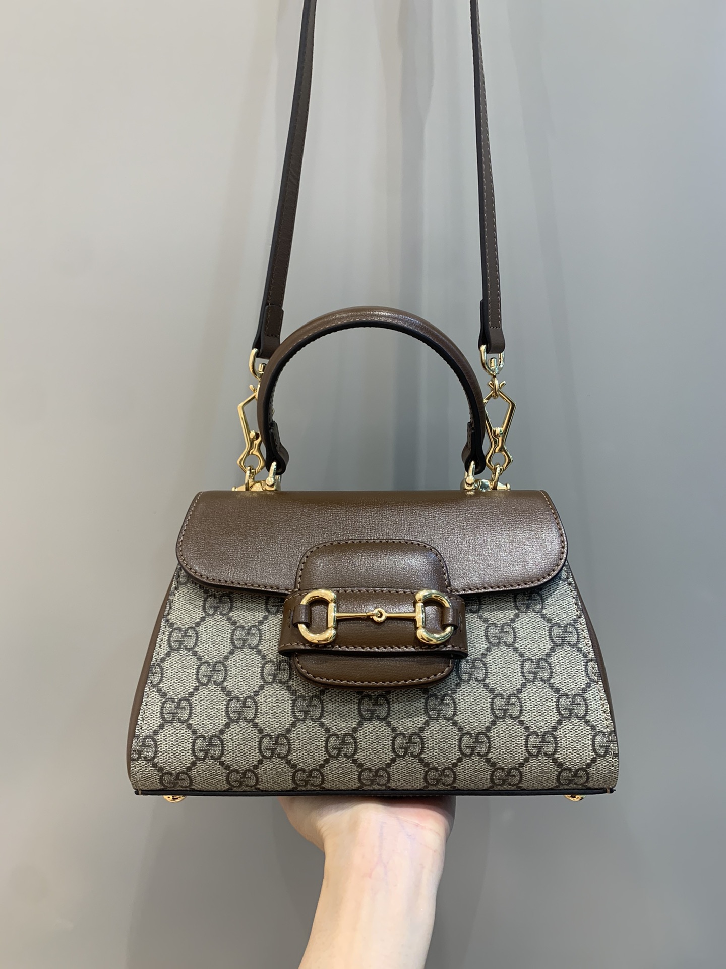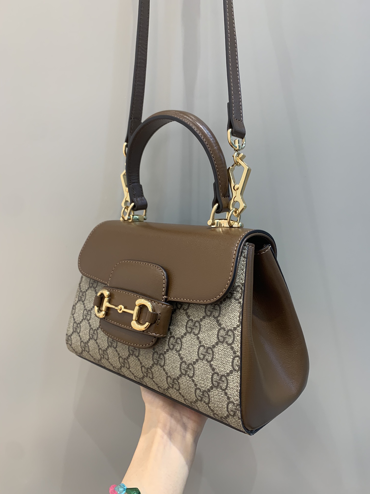 The Gucci Horsebit 1955 is presented as a top handle bag in light brown leather. The collection unifies details first introduced on the original bag that inspired the line from over six decades ago with a modern spirit, highlighting the Horsebit. Part of Gucci’s genetic code, the double ring and bar design has been established as one of the most distinctive elements among the House symbols borrowed from the equestrian world.