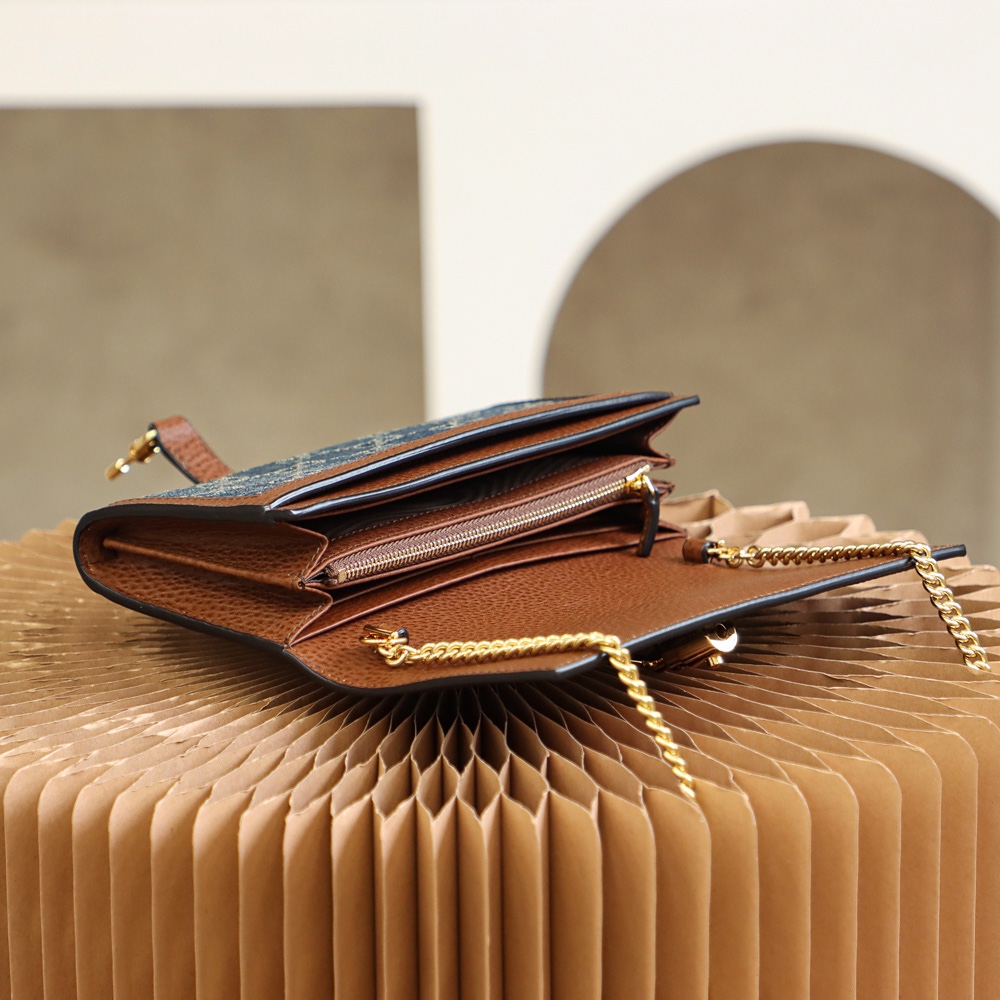 The world of Jackie 1961 evolves with the introduction of a continental wallet with delicate chain strap allowing it to be worn as a mini bag. The gold-toned piston detail pays homage to the original bag. Here, the accessory is presented in the House’s monogram canvas.