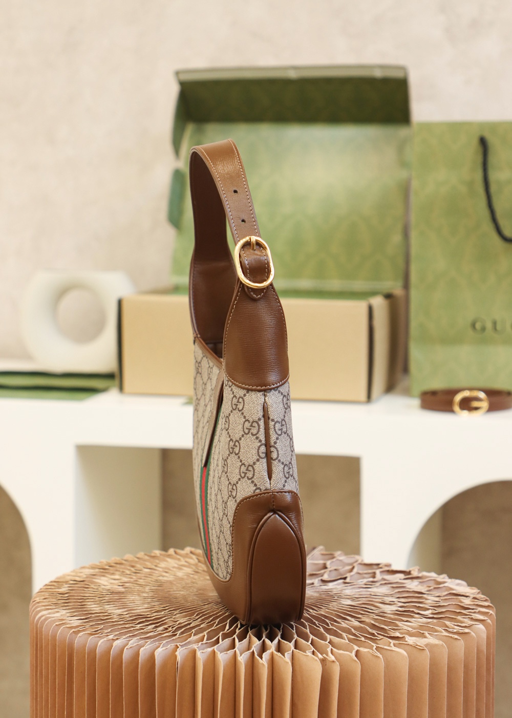 - Beige/ebony GG Supreme canvas, with brown leather trim