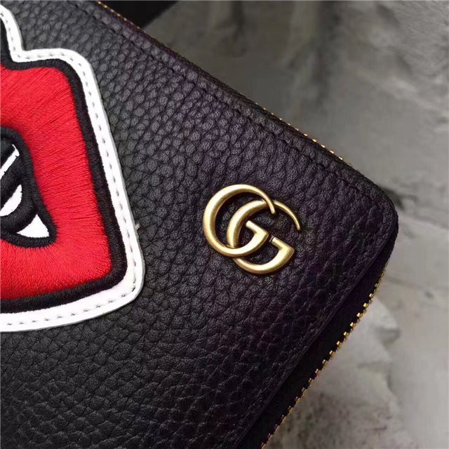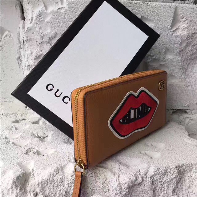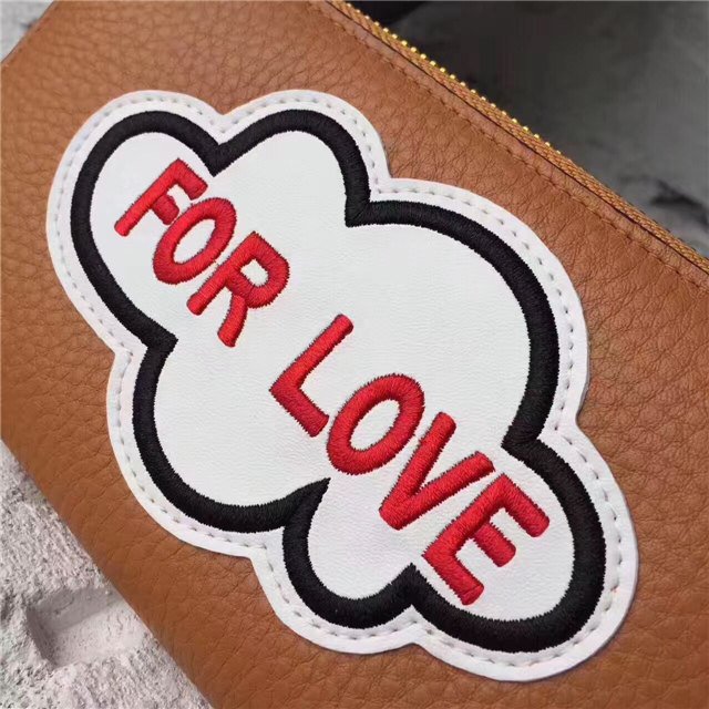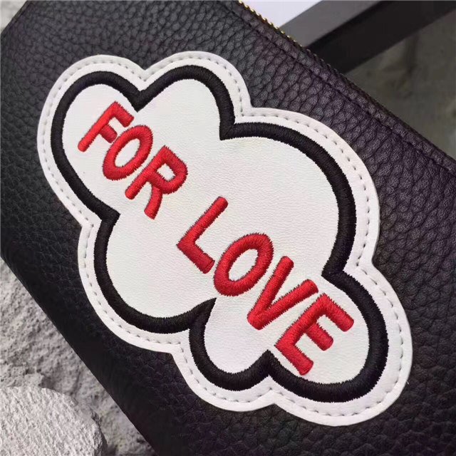 A leather zip around wallet embellished with embroidered appliques on each side, representing some of the romantic themes that run through Alessandro Michele”s collections. On the front is a mouth with the word “Blind” at the center, on the back a cloud with the words “For Love.”