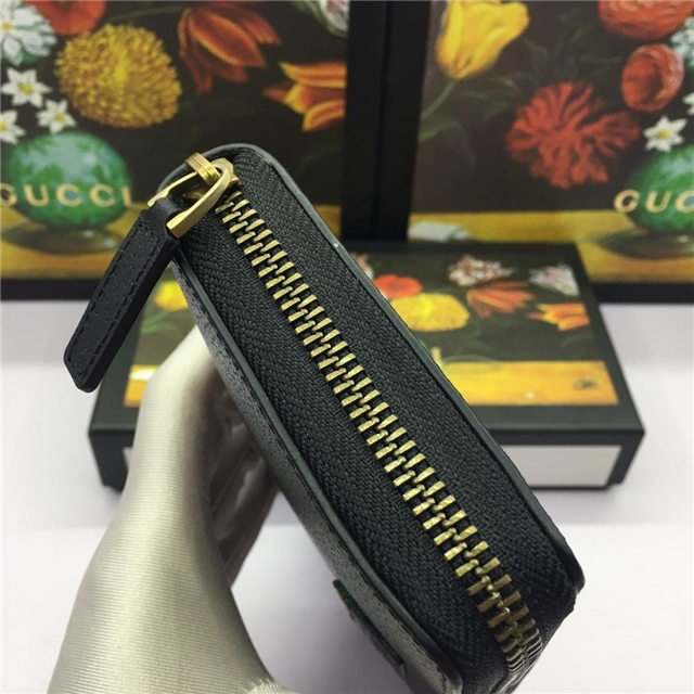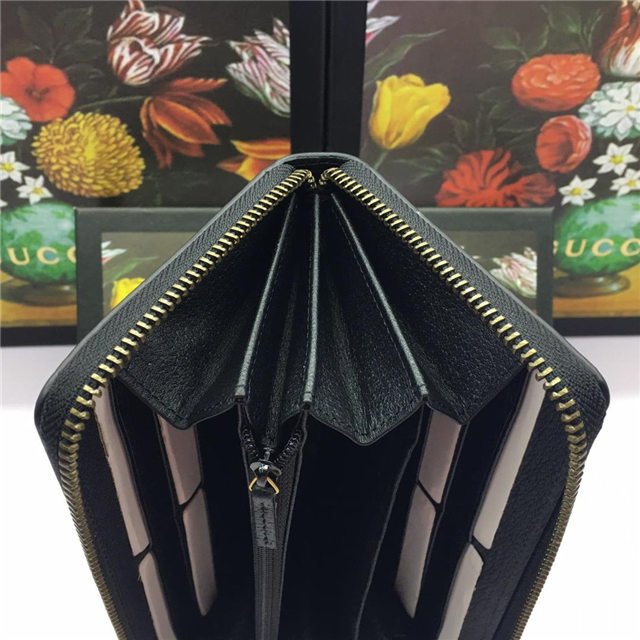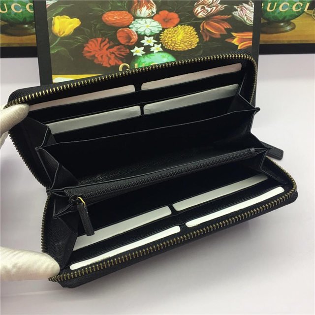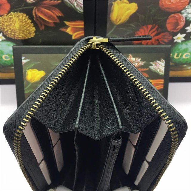 A leather zip around wallet with our Gucci embossed tab and signature green and red Web detail. Made in calfskin leather heat-stamped to achieve a boar effect, giving it a textured appearance.