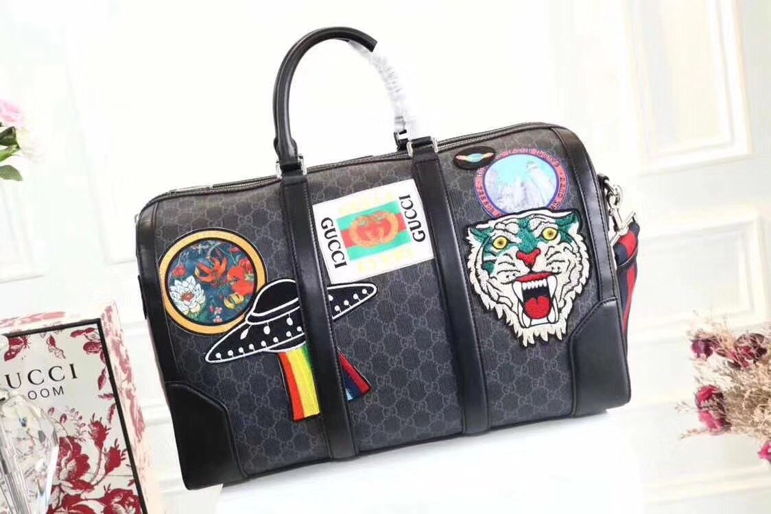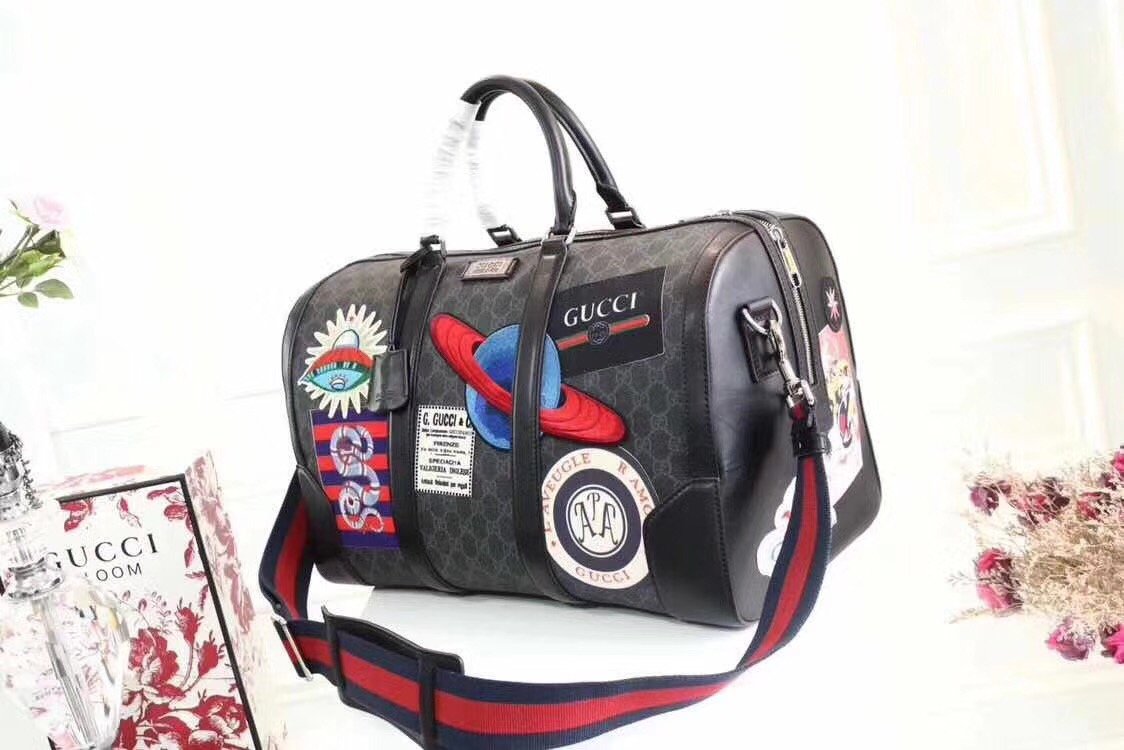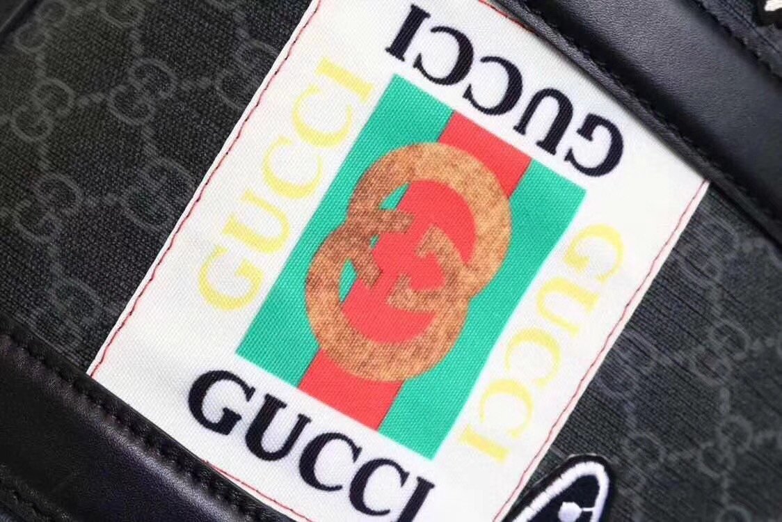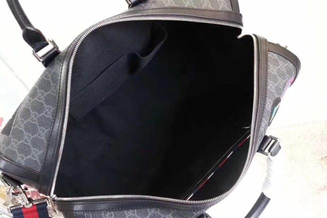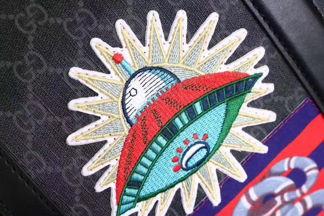 Travel continues to be a source of inspiration for the House. A collection of bags in the GG motif is updated in black/grey and enriched with a blend of contemporary embroideries like the UFO and vintage inspired details, including airmail trims and a Gucci vintage logo from the archives. The appliqu’s are individually embroidered and then skillfully hand-applied to each piece by specialized artisans. This process ensures that no two items will be alike, giving each a one-of-a-kind appearance.