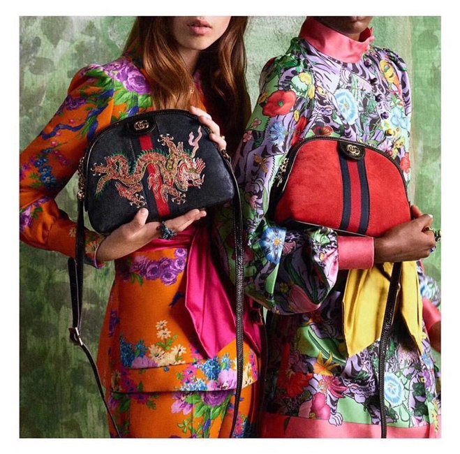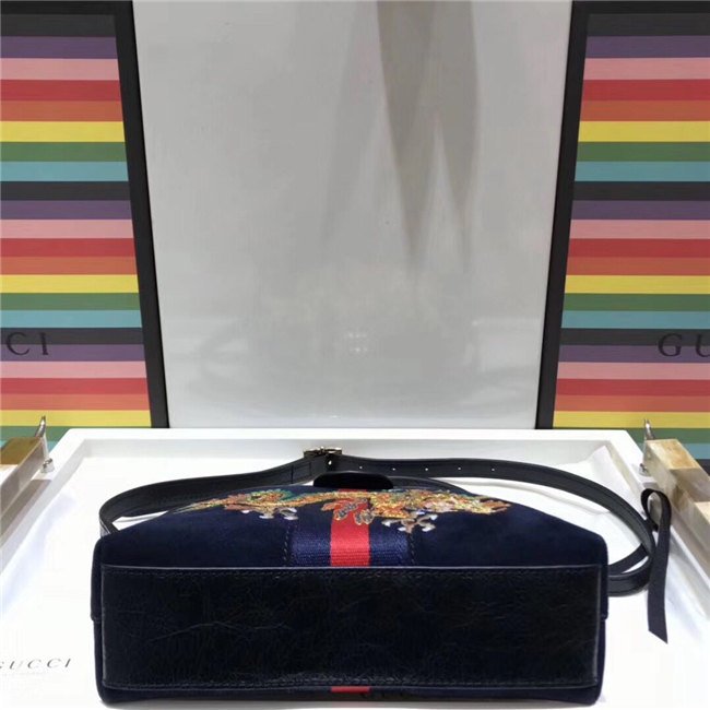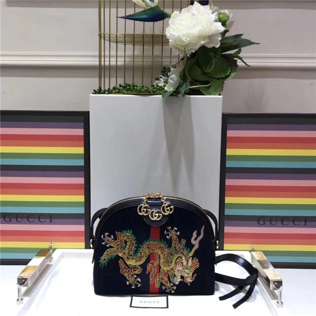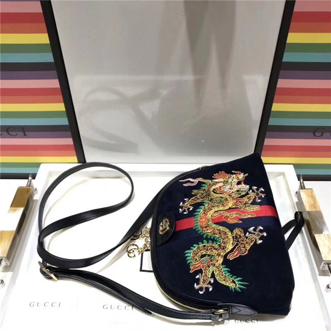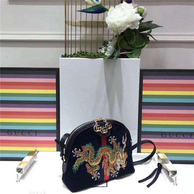 Crafted in suede with inlaid Web stripe detail, the shoulder bag has a domed shape that recalls vintage designs. Expertly embroidered by Italian artisans, the dragon motif extends across the front of the bag, speaking to the world of mystical and magical beings that now inhabit the world of Gucci.
