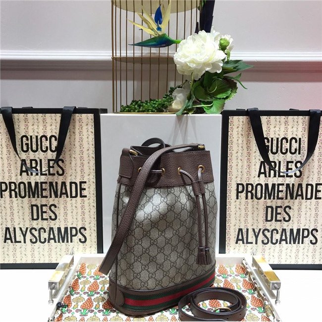 A drawstring shoulder bag with a bucket shape made in soft GG Supreme makes for a multi-functional addition in the world of Ophidia. Trimmed in brown leather, the accessory is defined by the green and red Web stripe inlaid at the bottom. Completed with an extra strap, that can be attached to the original one to emphasize the length, this bag can also be worn across the body.