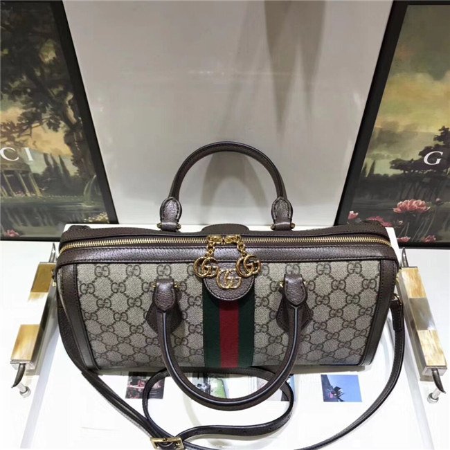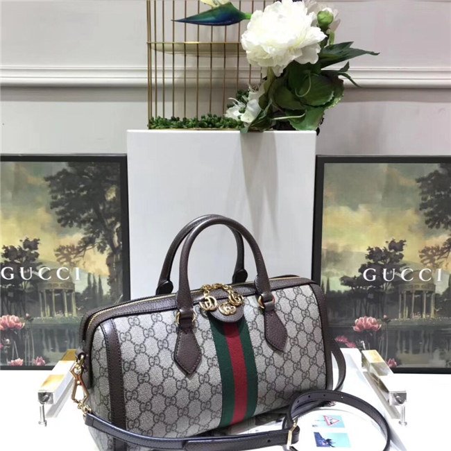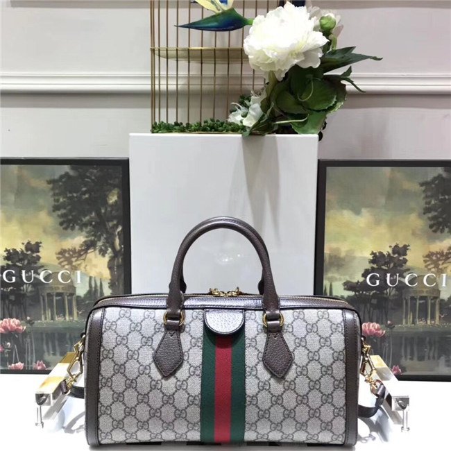 The world of Ophidia evolves with the introduction of a boston bag crafted in GG Supreme canvas with inlaid green and red Web stripe. The accessory is enhanced by a petite play on the Double G, an archival Gucci code from the 70s that appears atop a leather tab detail and on the zipper pull. The bag is completed with a detachable shoulder strap which allows it to be carried in multiple ways.
