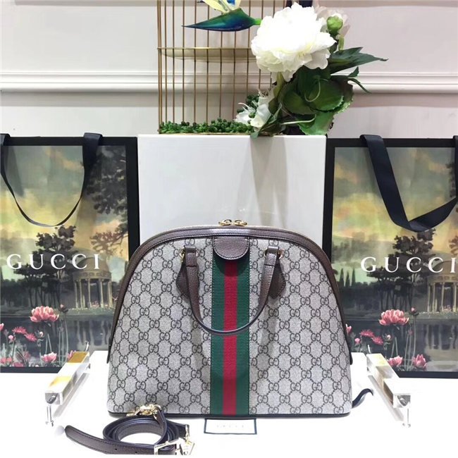 The world of Ophidia evolves with the introduction of this medium top handle bag crafted in GG Supreme canvas with inlaid green and red Web stripe. Defined by a domed shape that recalls vintage designs, the accessory is enhanced by a petite play on the Double G, an archival Gucci code from the 70s that appears atop a leather tab detail and on the zipper pull. The bag is completed with a detachable shoulder strap which allows it to be carried in multiple ways.