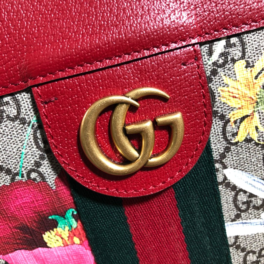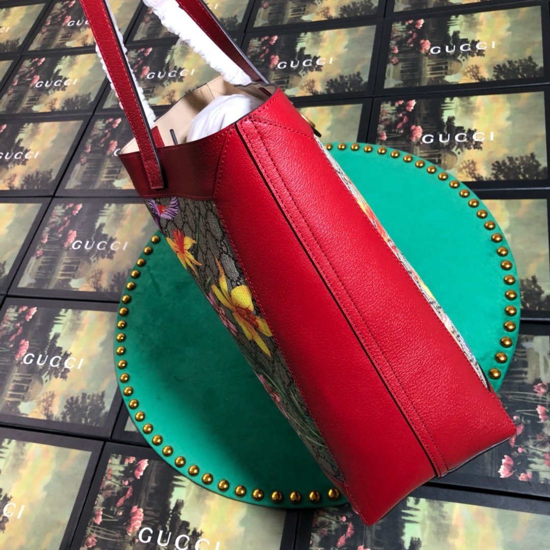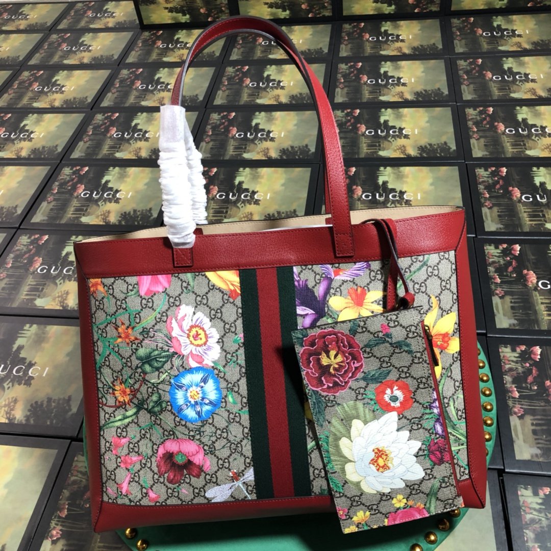 Gucci tote bag in GG Supreme canvas with Flora print, a material with low environmental impact, with leather trim.