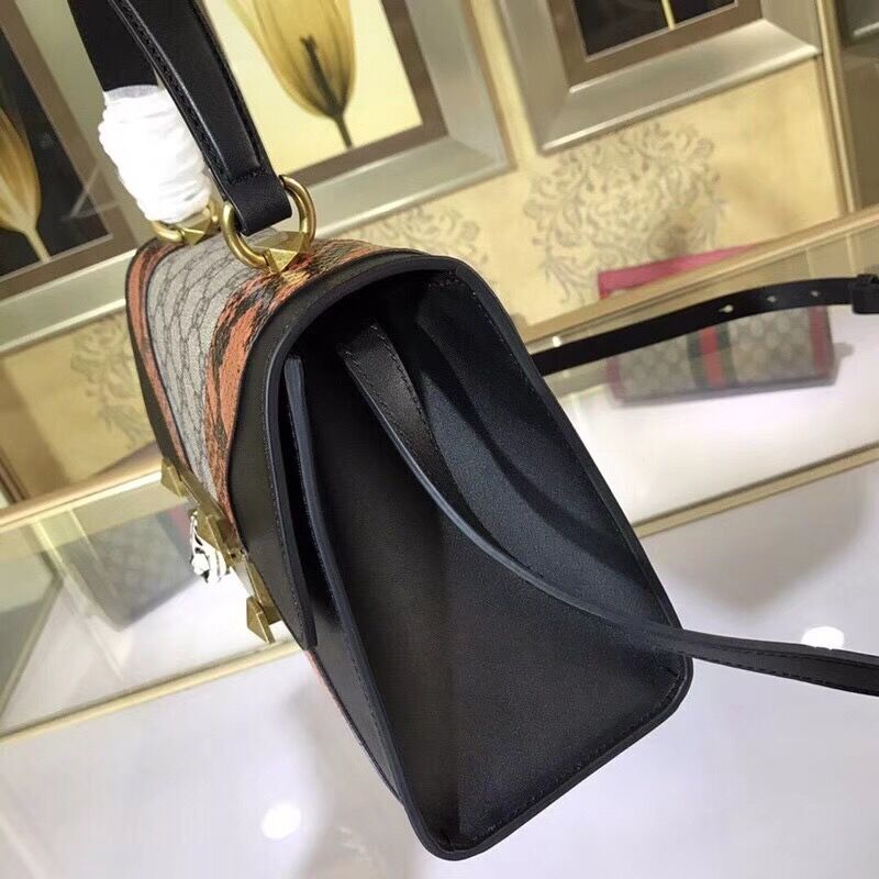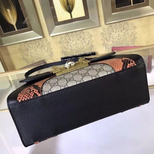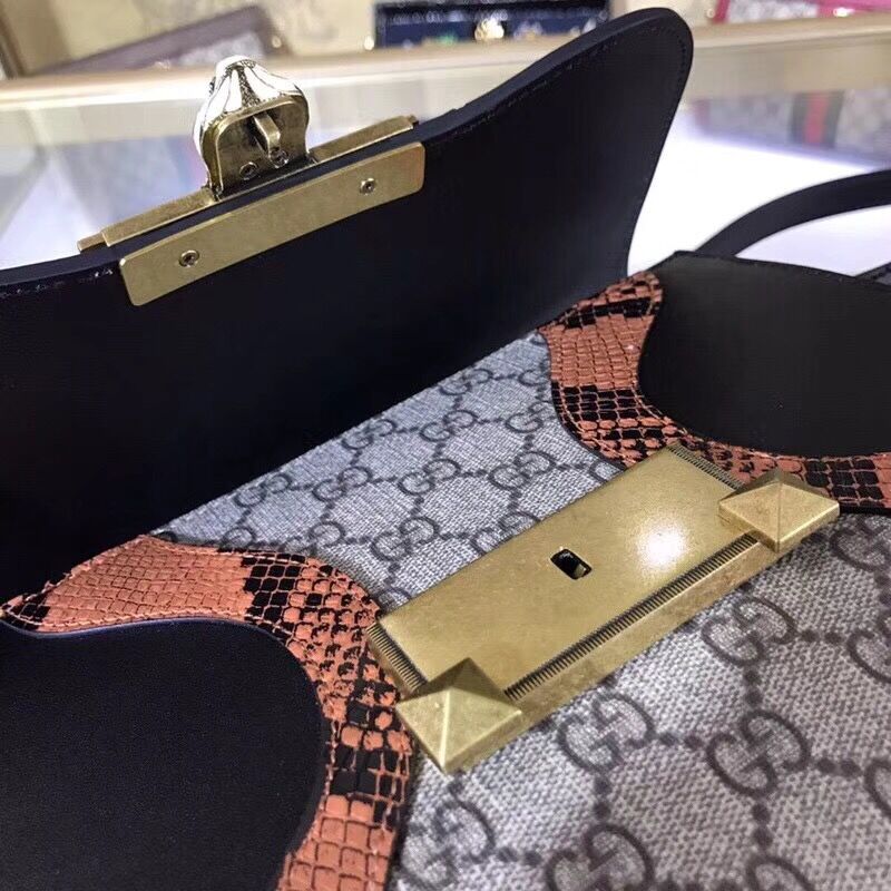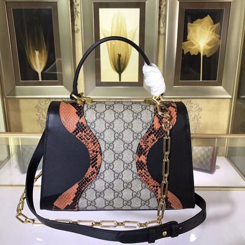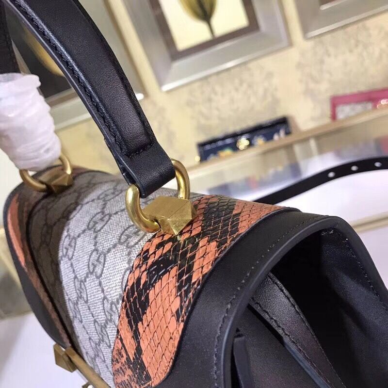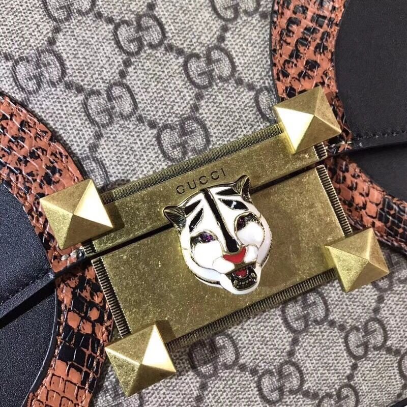 The top handle bag is defined by an archival metal lock closure with an enameled feline head with red Swarovski eyes. The feline head has become a recognizable Gucci code seen throughout every category. The abstract design is made from GG Supreme canvas trimmed with a super soft, delicate leather paired with glossy snakeskin.
