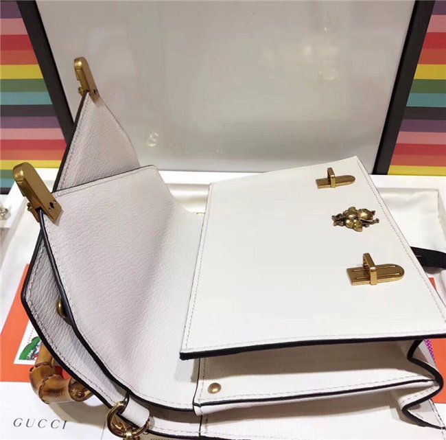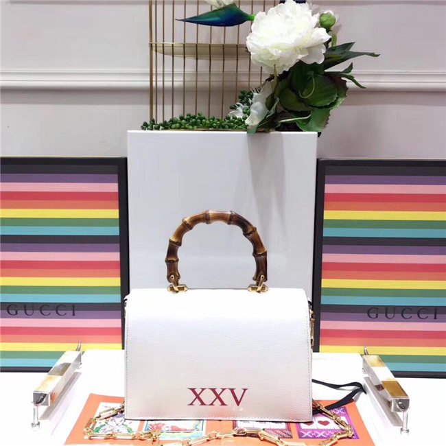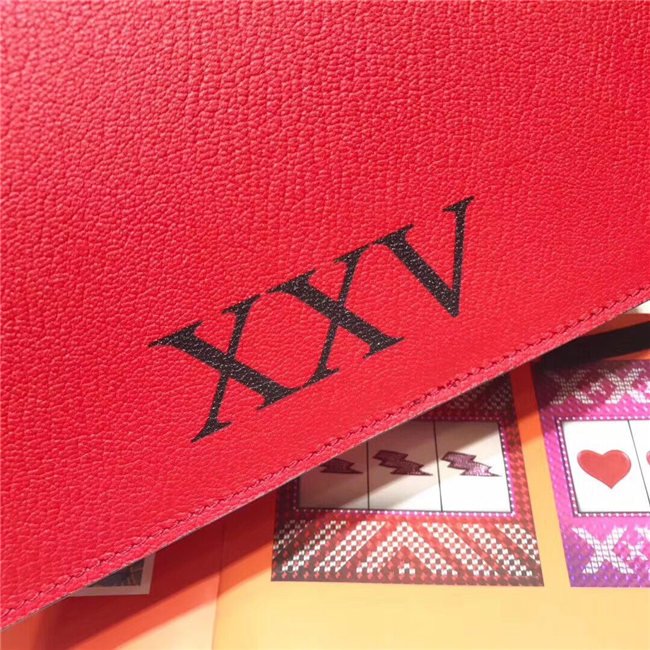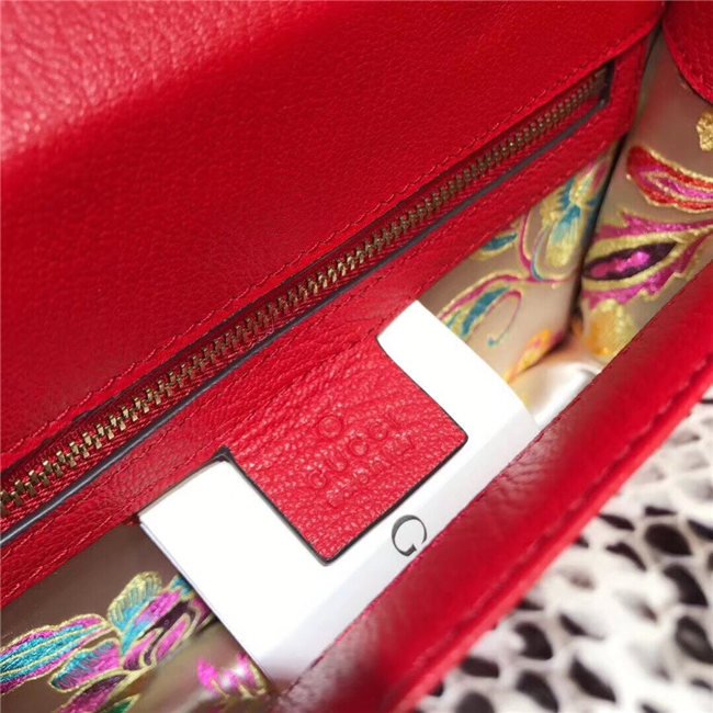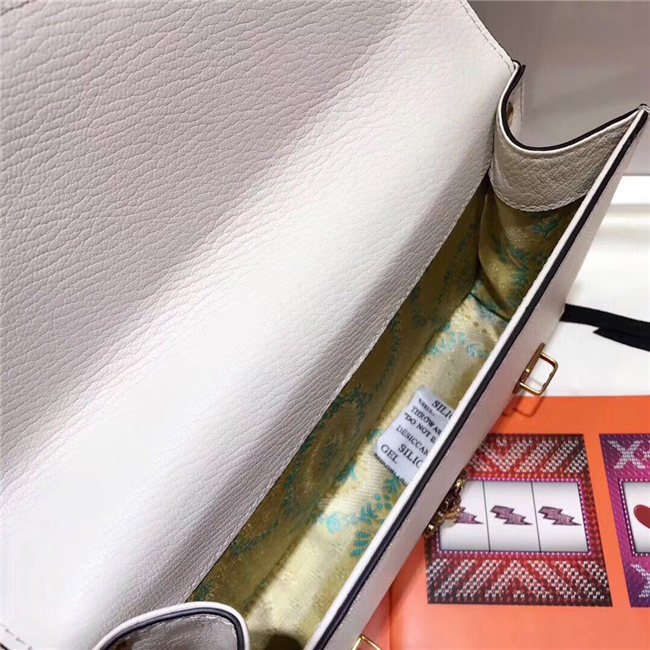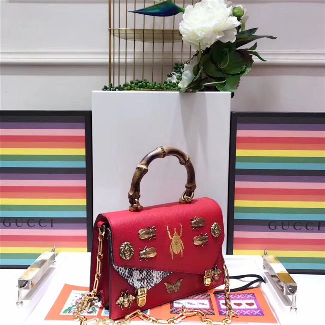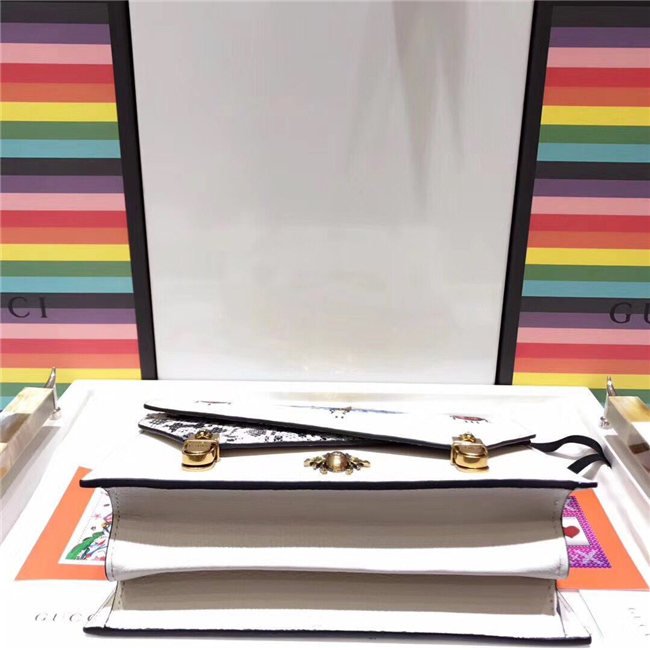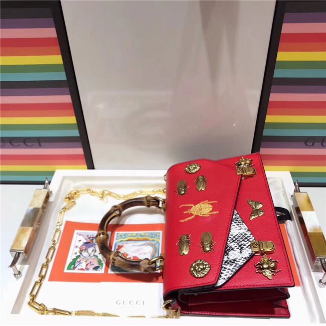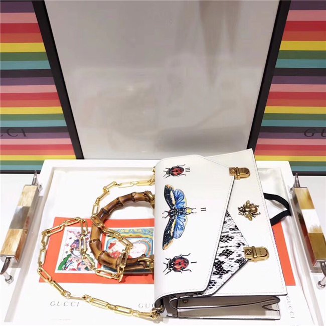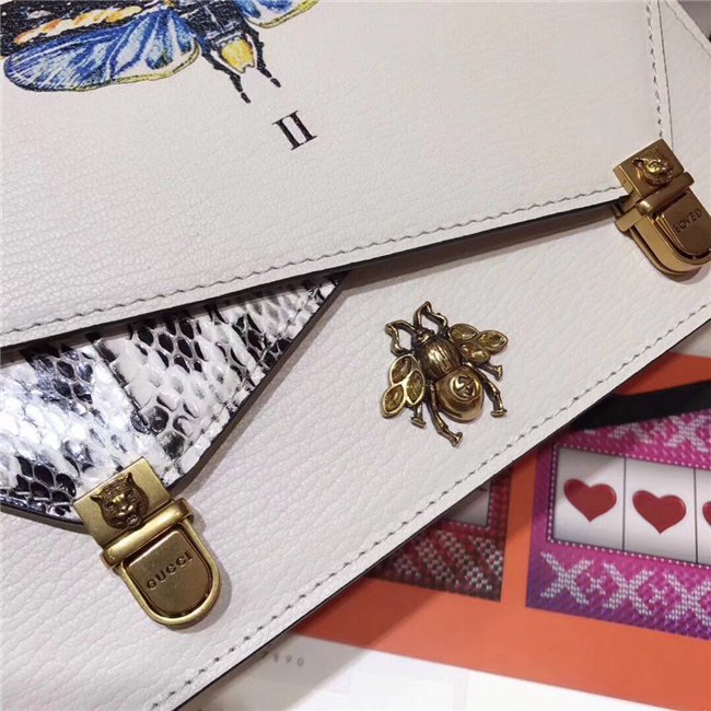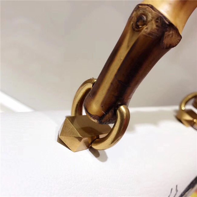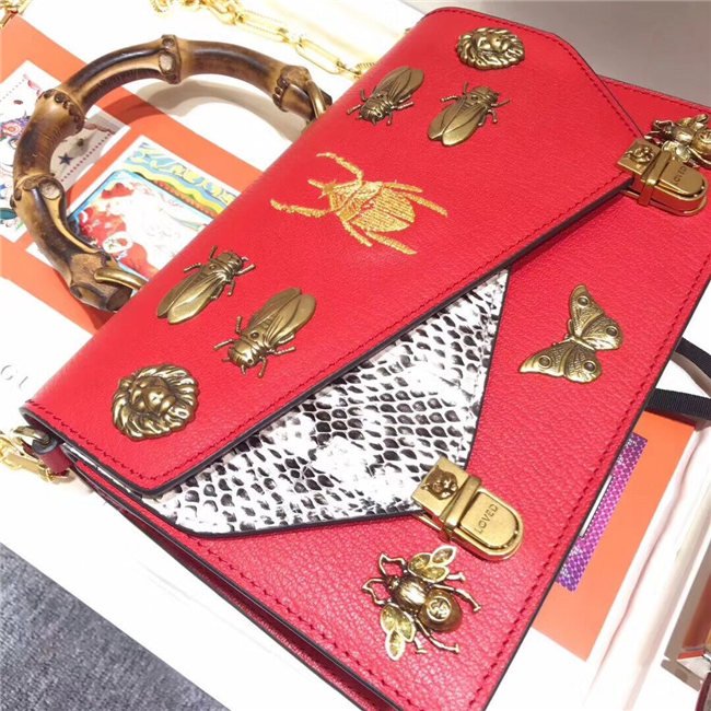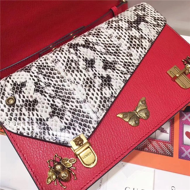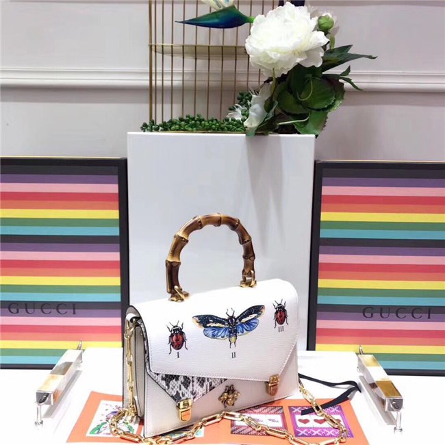 These strange but captivating symbols, seen throughout the Fall Winter 2017 collection, are juxtaposed with the iconic bamboo handle. The structured top handle shape features a compartmentalized construction with a double flap closure. Each flap-one in contrast snakeskin-secures with a clasp closure.