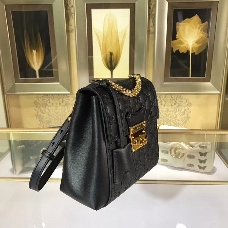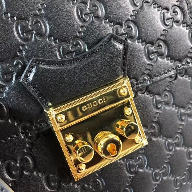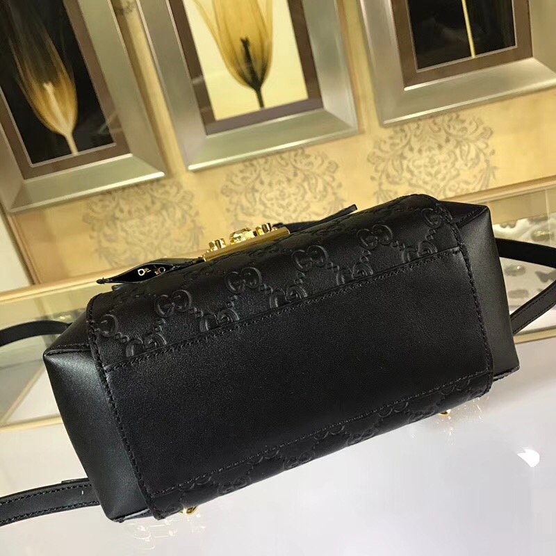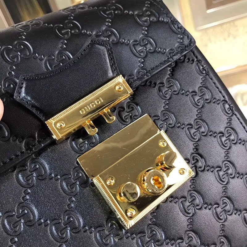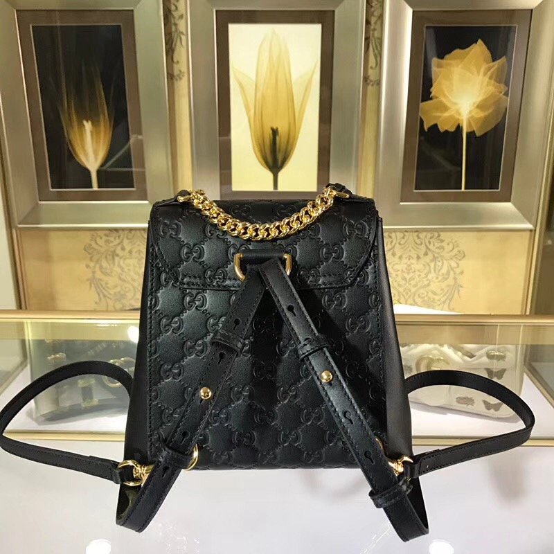 The structured backpack features defining details from the Padlock collection. The chain top handle is distinctive to the line, along with the key lock closure pulled straight from the archives. The key is placed in a detachable leather key case. Made in heat debossed Gucci Signature leather with a defined print and firm texture.