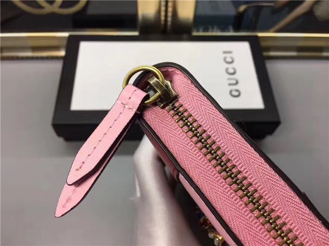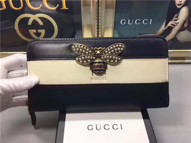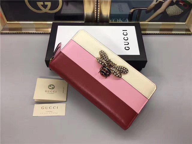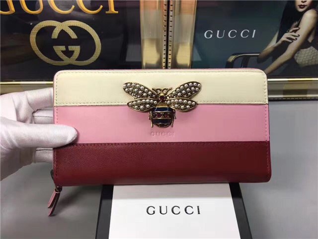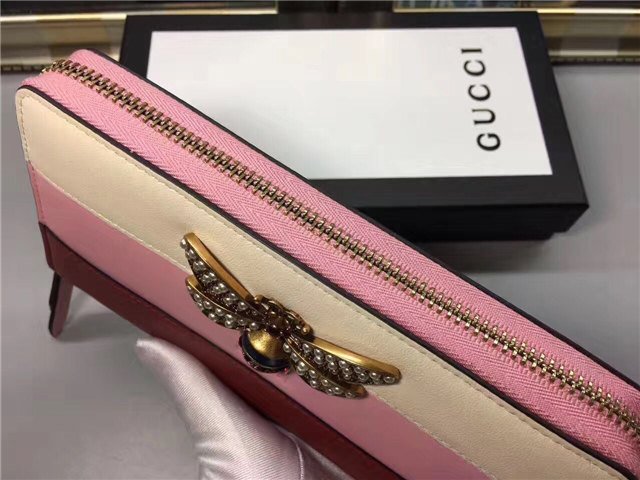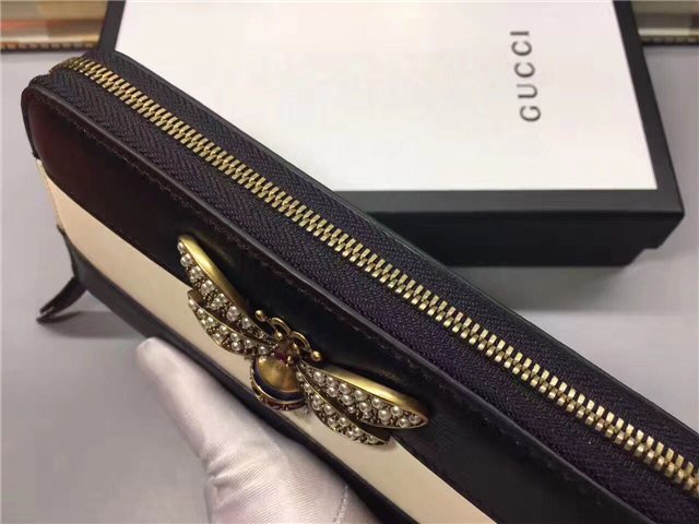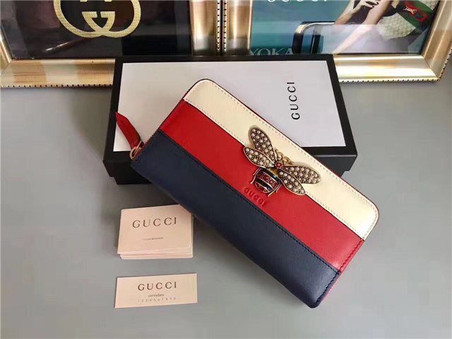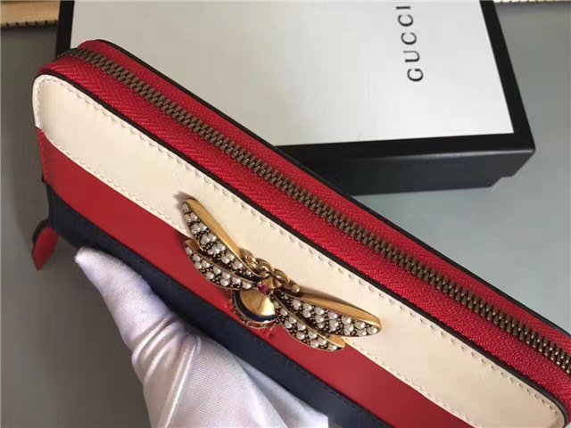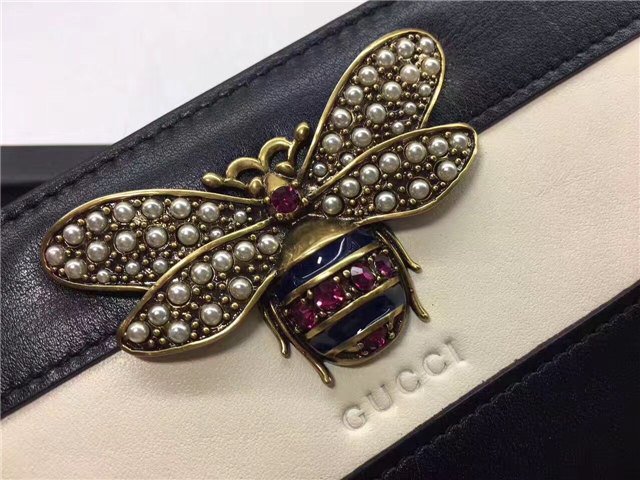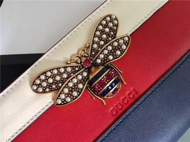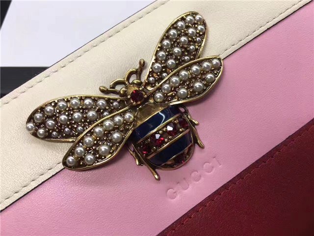 The bee-a historical Gucci code taken from the 70s archives-is enriched by glass pearls and multicolor crystals. Made in smooth leather with a slight shine in a color block design.