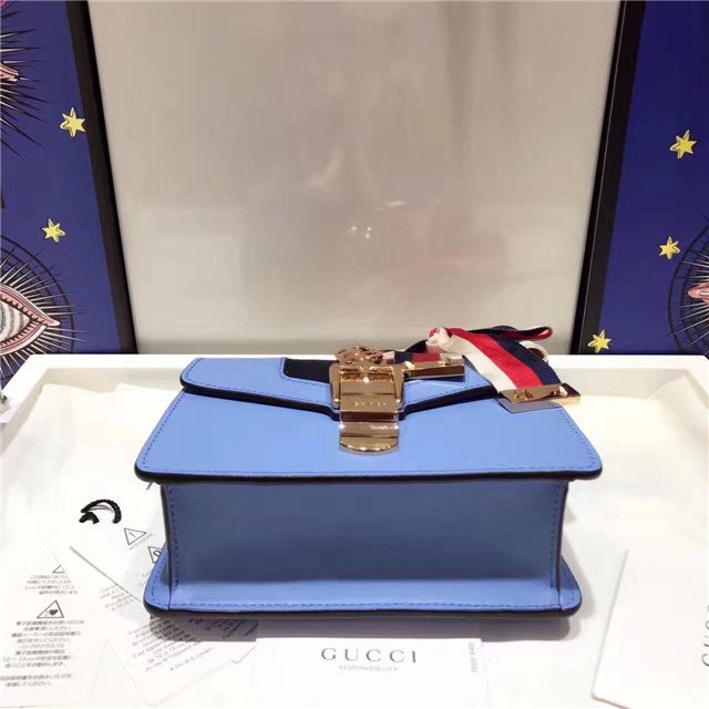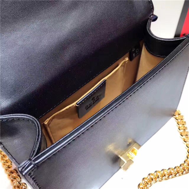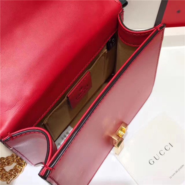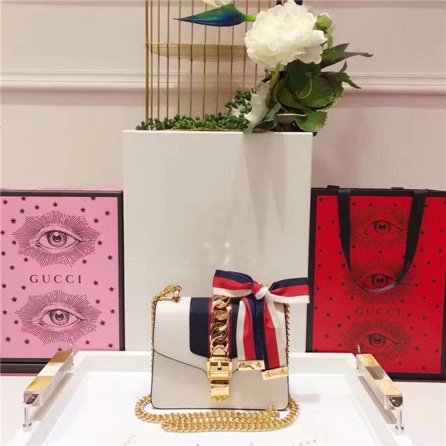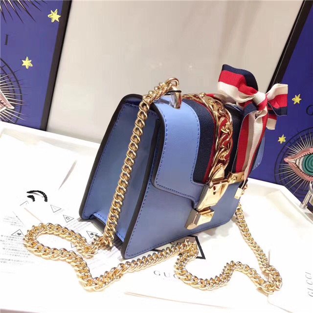 Our Sylvie bag in a mini structured shape with a chain shoulder strap and grosgrain Web bow. The nylon Web is embedded under the leather and decorated with a gold toned chain and buckle. Made in our smooth, classic leather.