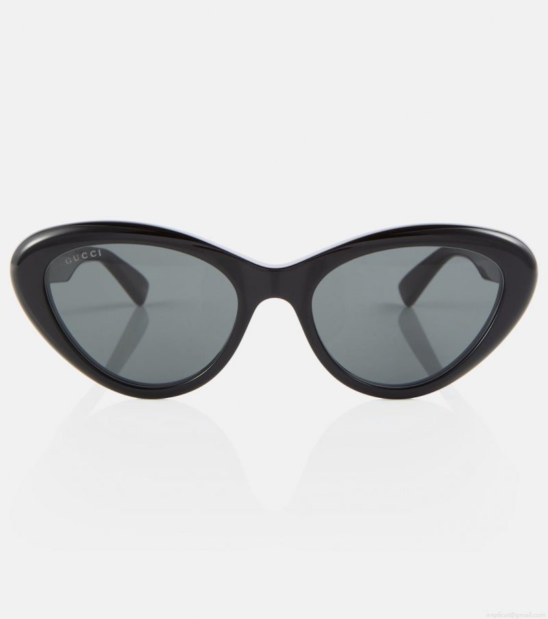 These cat-eye sunglasses from Gucci evoke a sense of retro Hollywood glamour. These soft-cornered frames are made from glossy black acetate and branded with gold-tone logo lettering.
