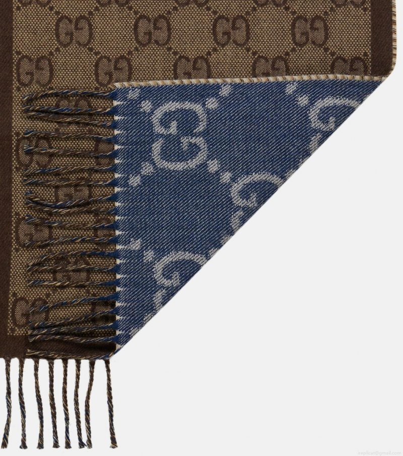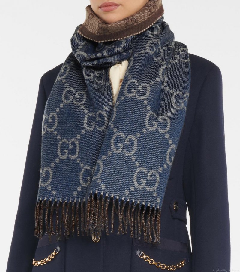 Showcase Gucci’s signature monogram pattern this season with this cozy wool jacquard scarf. The reversible design can be styled to show the label’s iconic monogram in navy on one side or, for warmer tones, a finer GG pattern in a rich brown on the other. With a matching fringe and lightly colored border, this soft style is the key to enviable winter dressing.