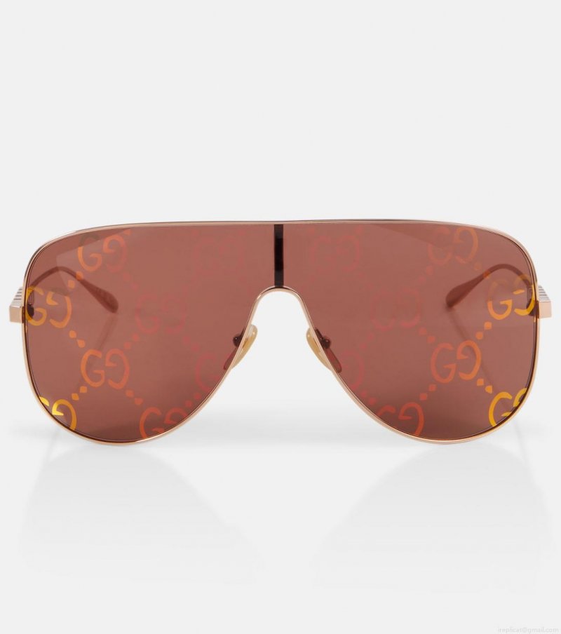 These sunglasses from Gucci are defined by an oversized, shield-like silhouette. The design is enhanced by decorative GG detailing on rose-colored lenses and a metal frame with brand lettering on the temples.