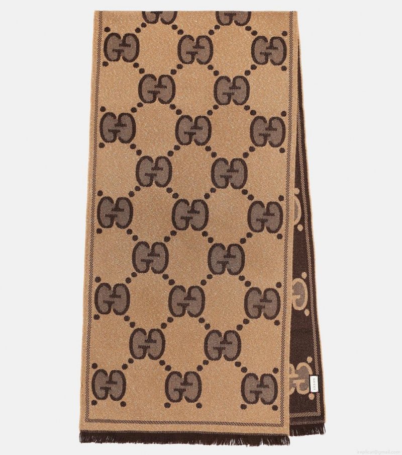 Show your love for Gucci with this scarf rendered in a jacquard GG pattern. Let this wool-blend style's biscuity tones complement a neutral ensemble when it's cold outside.