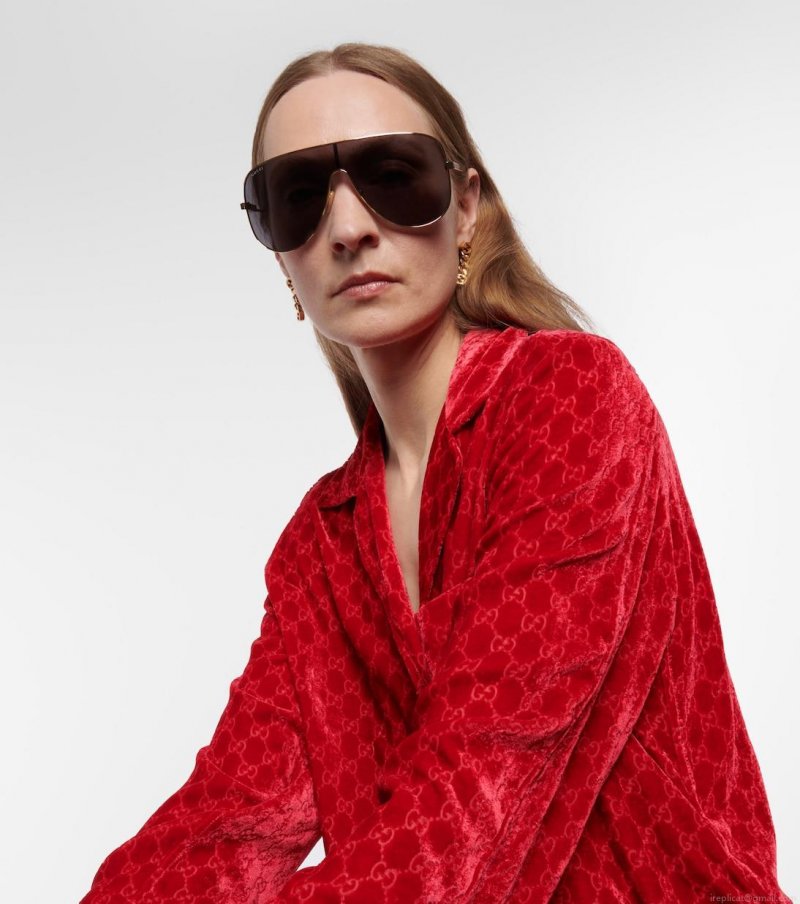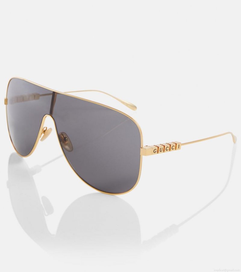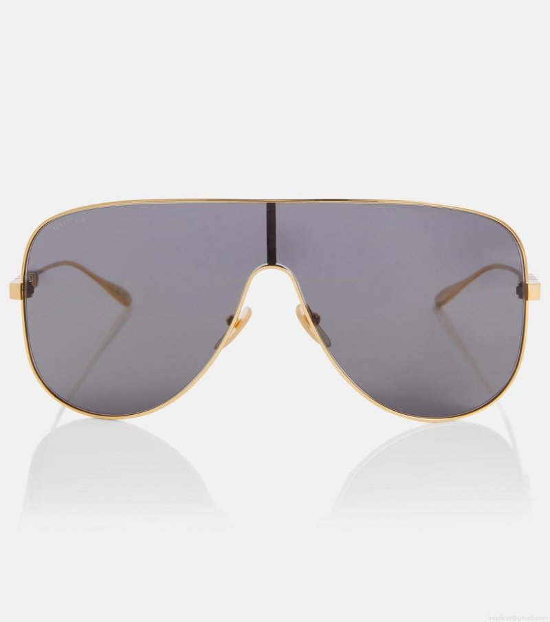 These sunglasses from Gucci will enhance your ensemble with a stylish edge. This mask style has a gold frame with logo detailing on the sides and wide grey lenses.