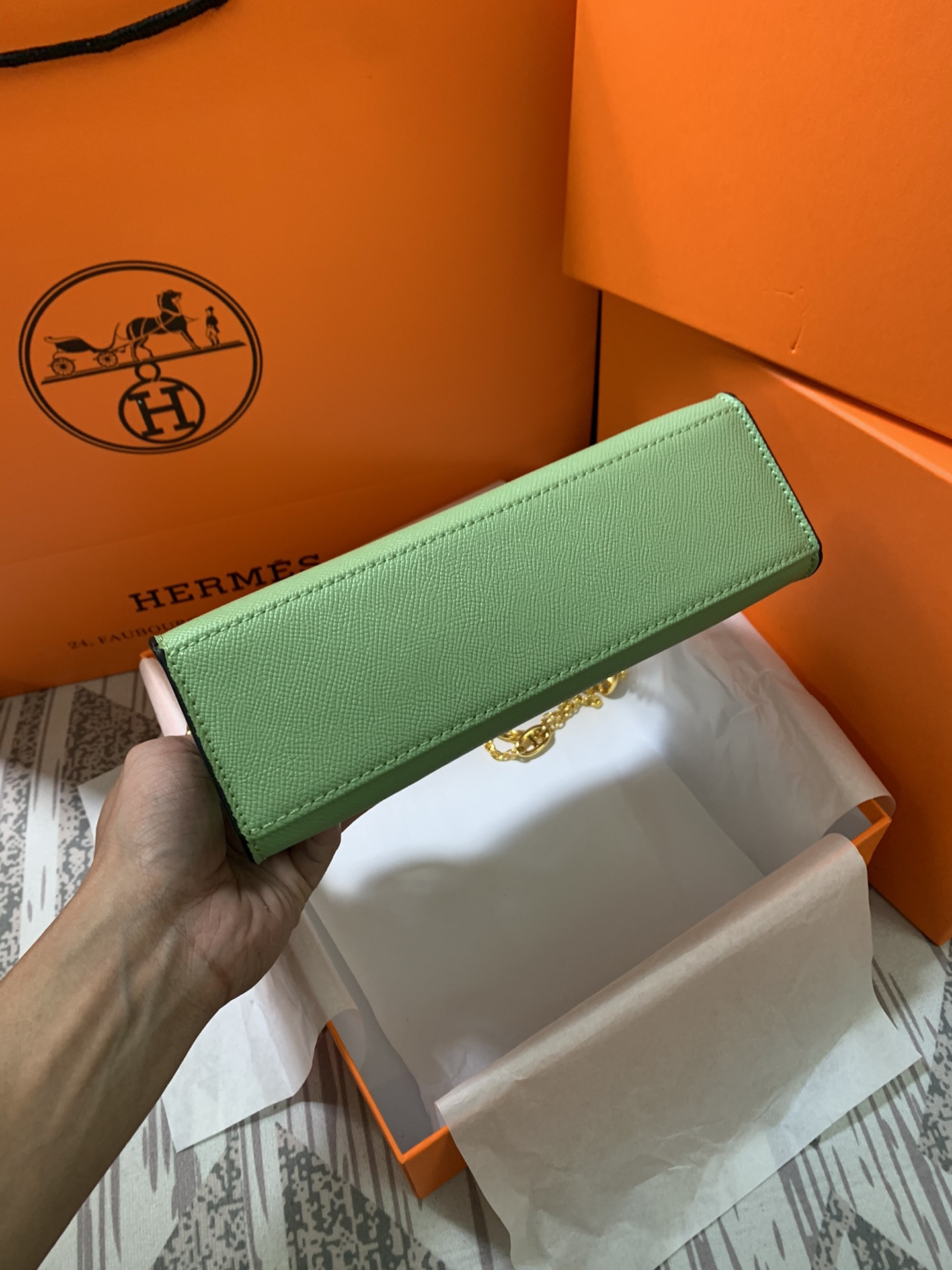 Many customers also adore this bag with a logo-covered lid. Despite its small and dainty appearance, it can accommodate a phone, lipstick, keys, and a wallet effortlessly.