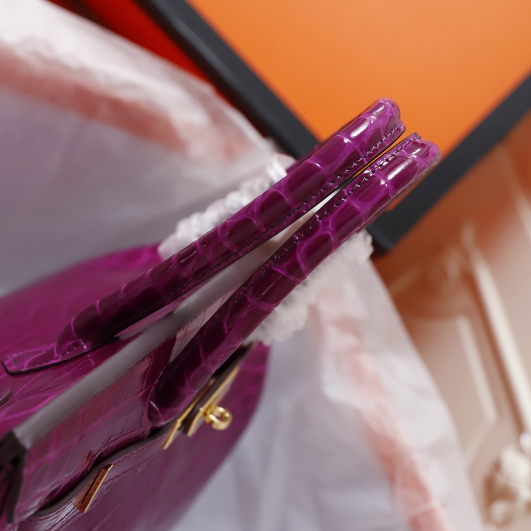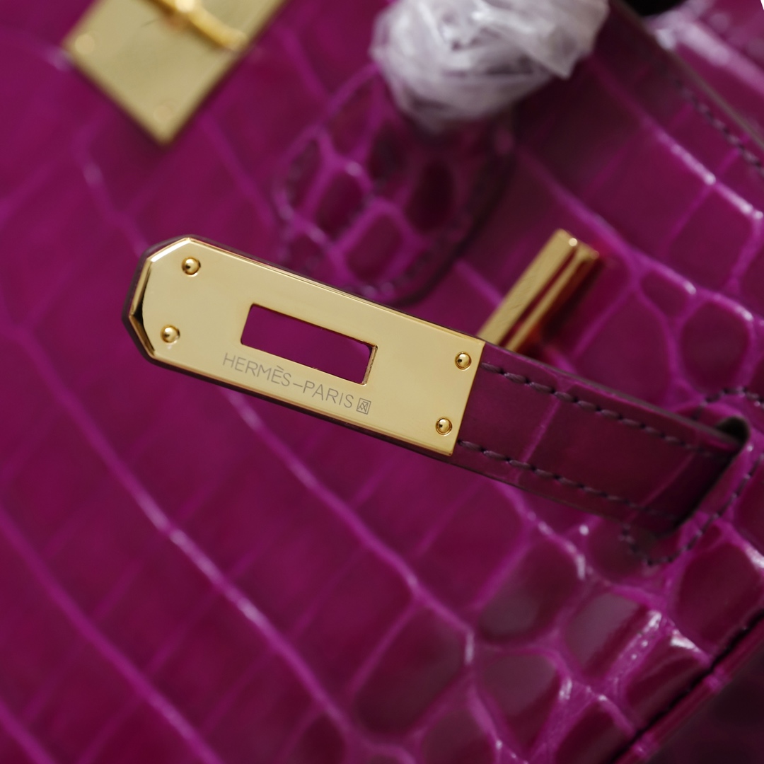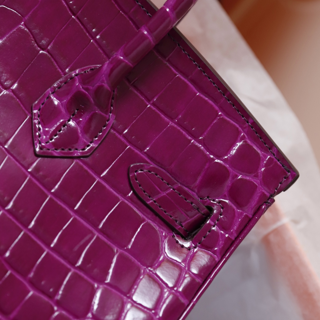 H Birkin in shiny crocodile leather, Vert Fonce. It is the most stunning and classic high-gloss crocodile pattern in Hermès! The pattern is one-of-a-kind, with pure steel hardware, showcasing an astonishing elegance.