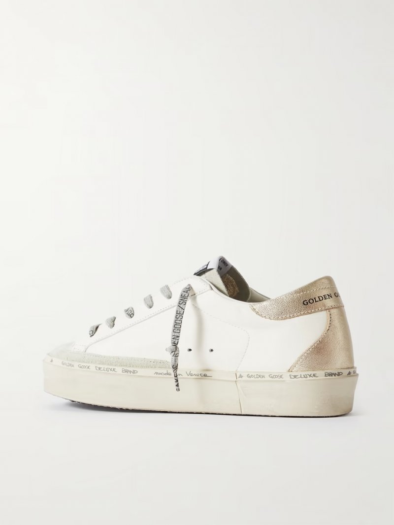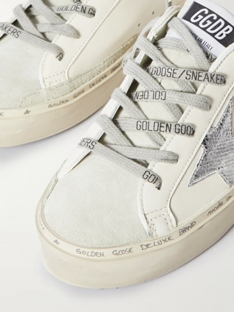 - White leather, silver snake-effect leather, gold metallic leather (Cow), gray suede