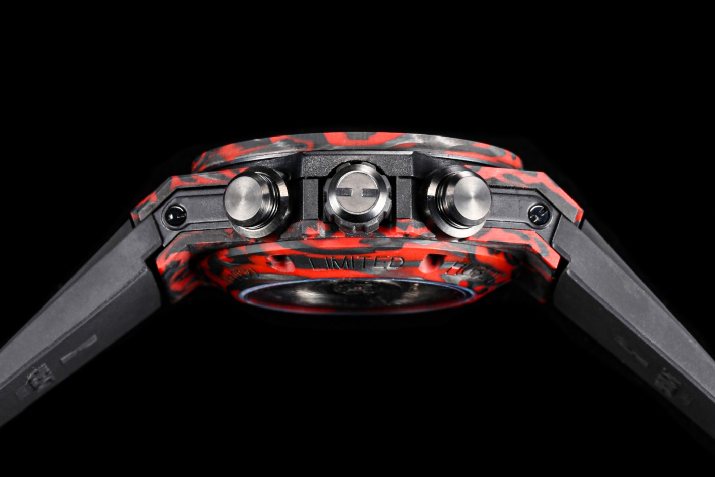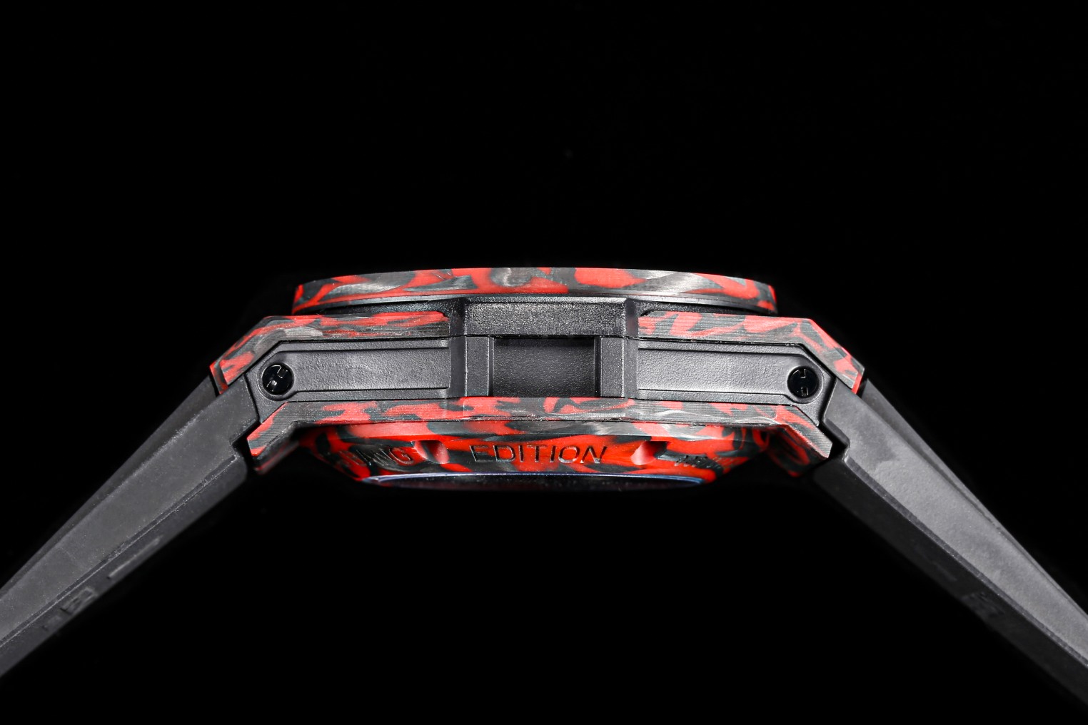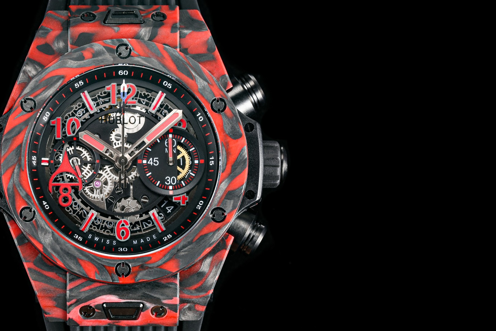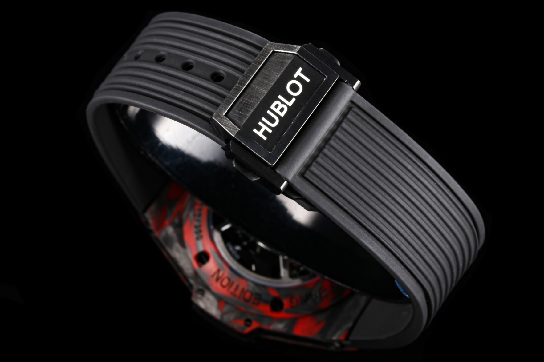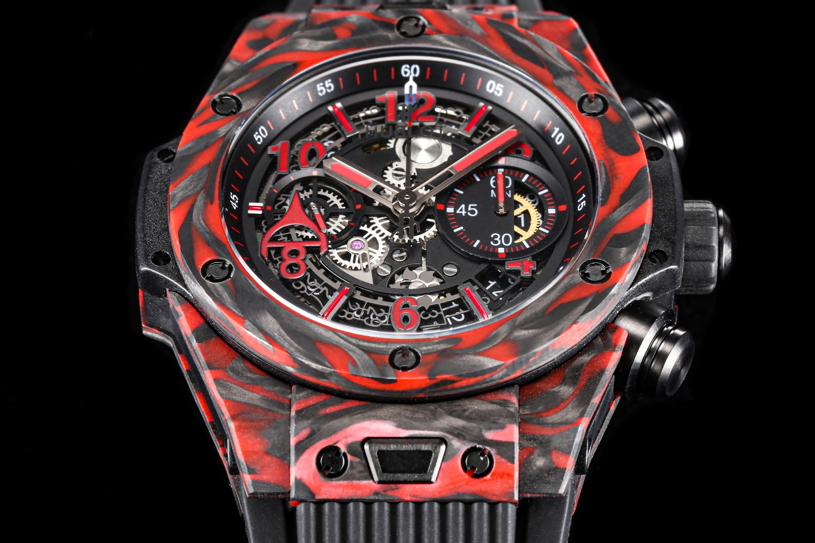 The Big Bang Carbon Fiber Watch from the Big Bang series adopts a bold red and blue color scheme, creating a stunning visual impact. The intricate internal mechanical structure is clearly visible through the transparent case, while the design of the hands and hour markers adds a strong sense of rhythm and architecture to the entire dial, showcasing the extraordinary charm of time.