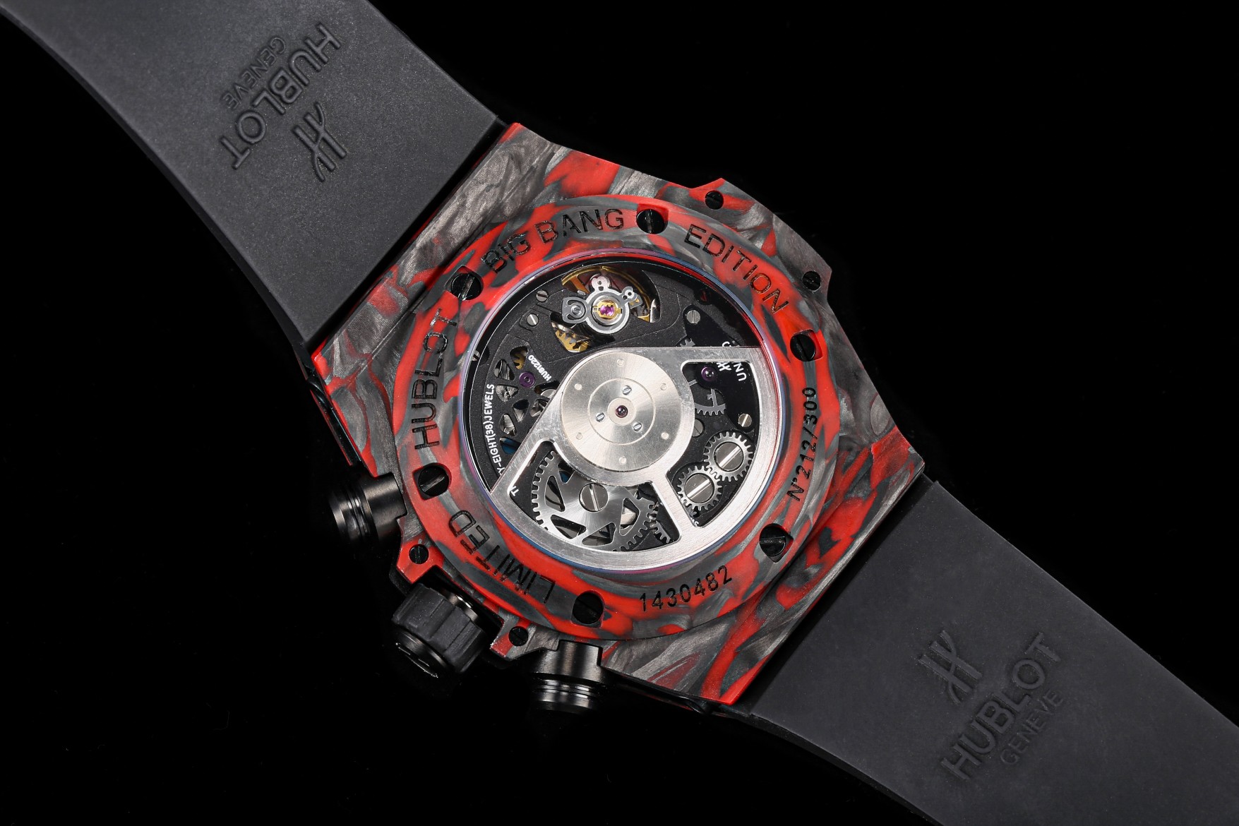 The Hublot Big Bang Carbon Fiber Watch features the remarkable HUB1242 movement, which is visible through the transparent case, showcasing the beauty of its extraordinary mechanical construction.