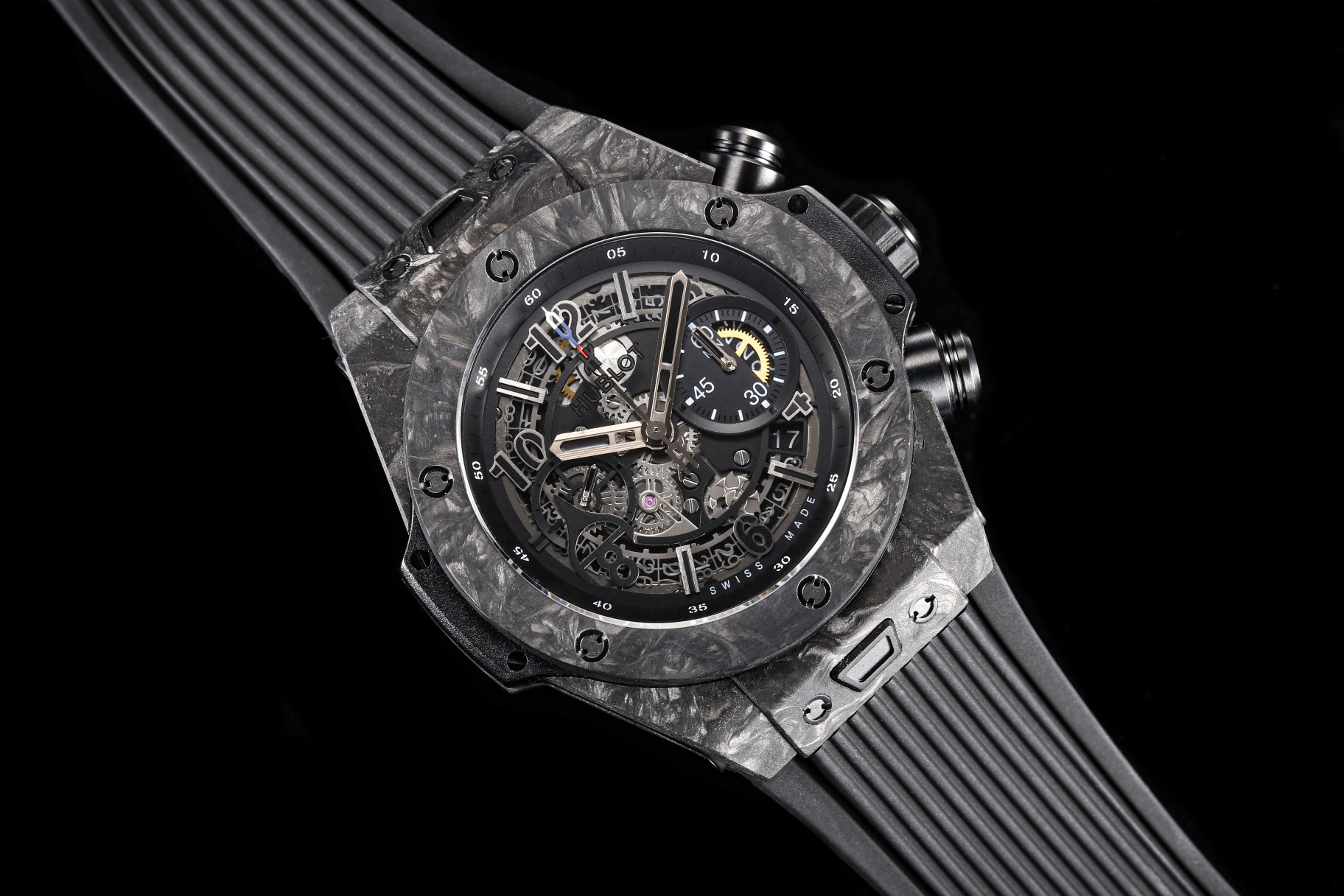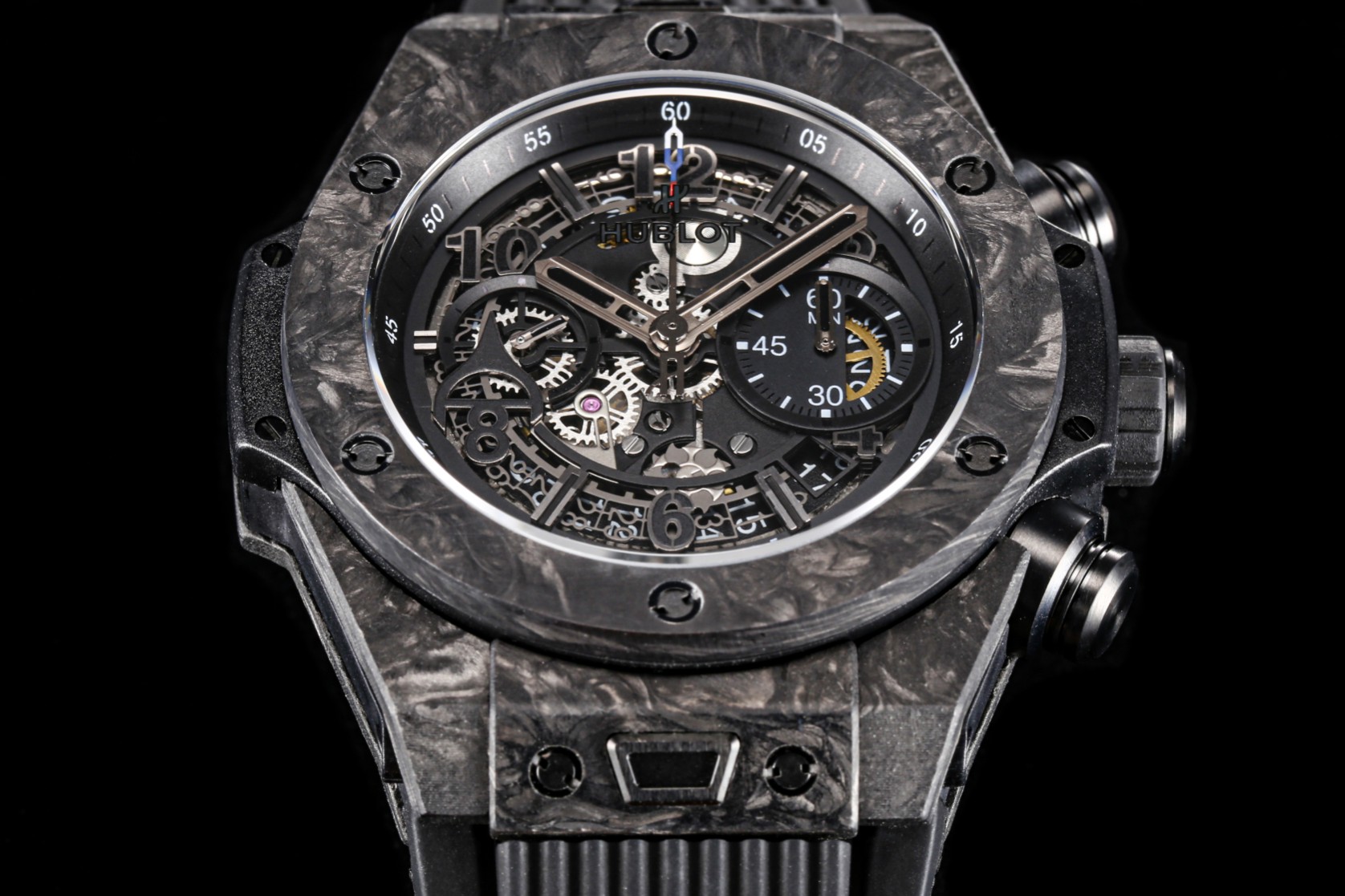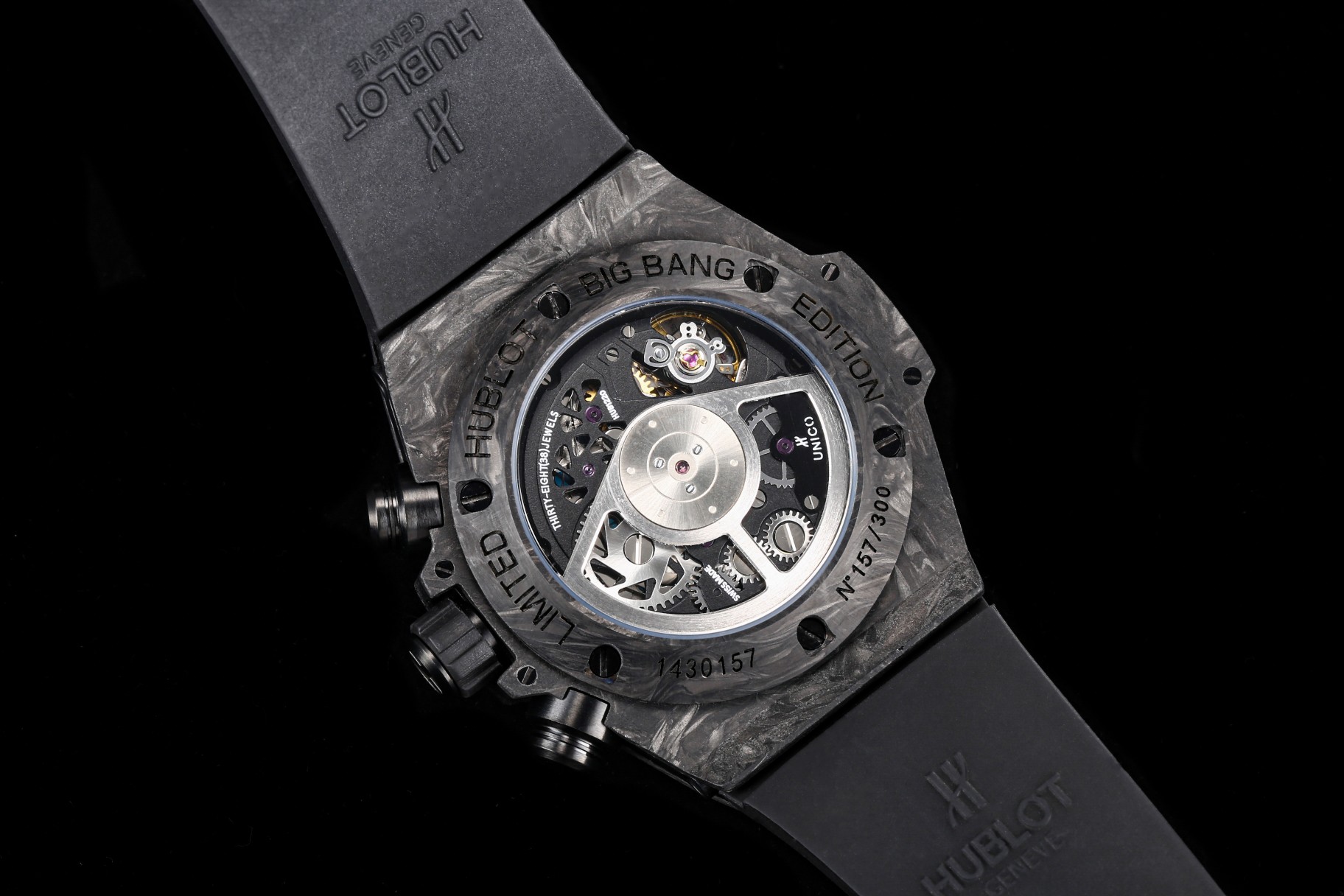 The Hublot Big Bang Carbon Fiber Watch features the remarkable HUB1242 movement, which is visible through the transparent case, showcasing the beauty of its extraordinary mechanical construction.