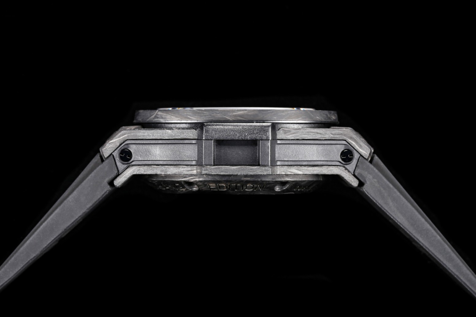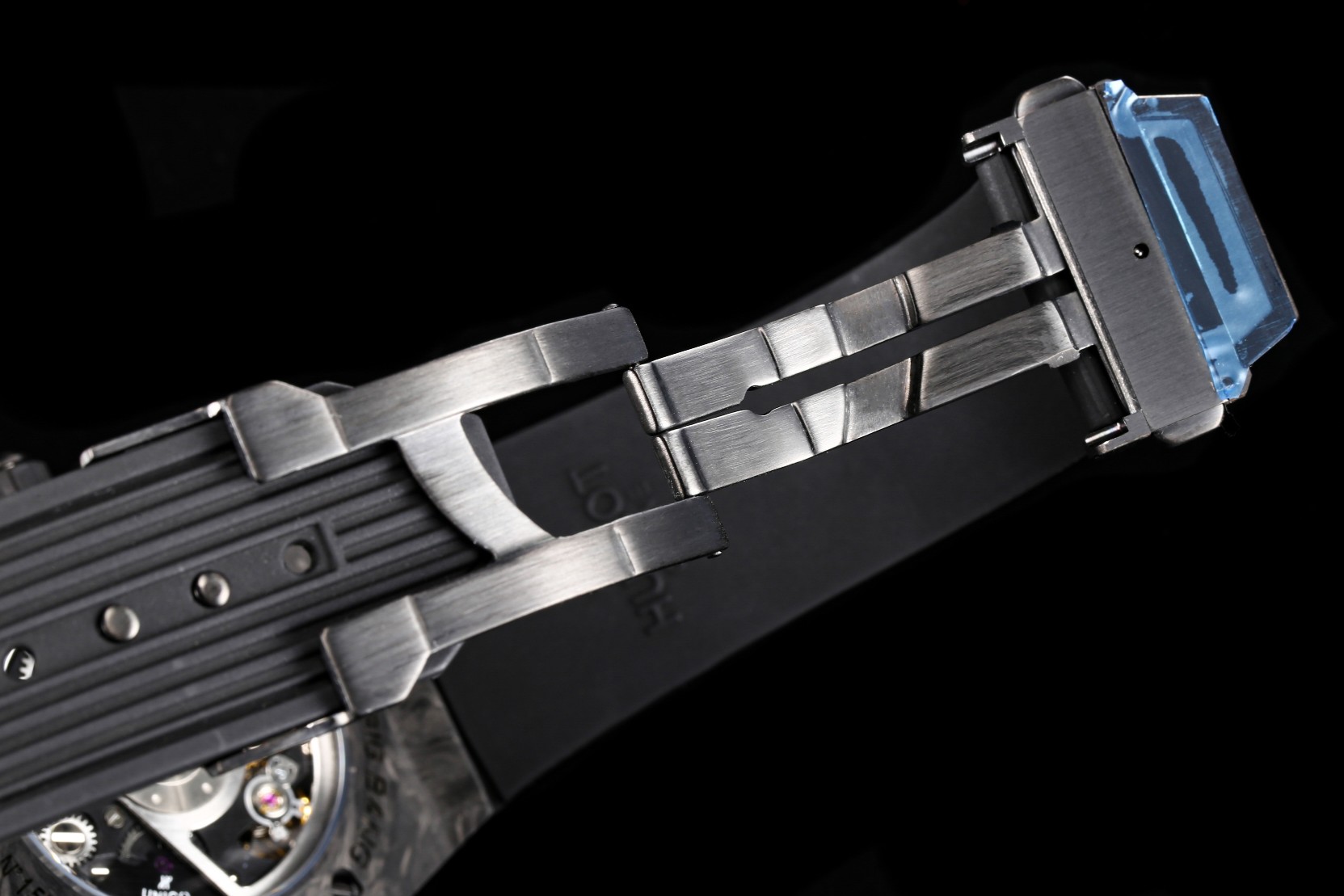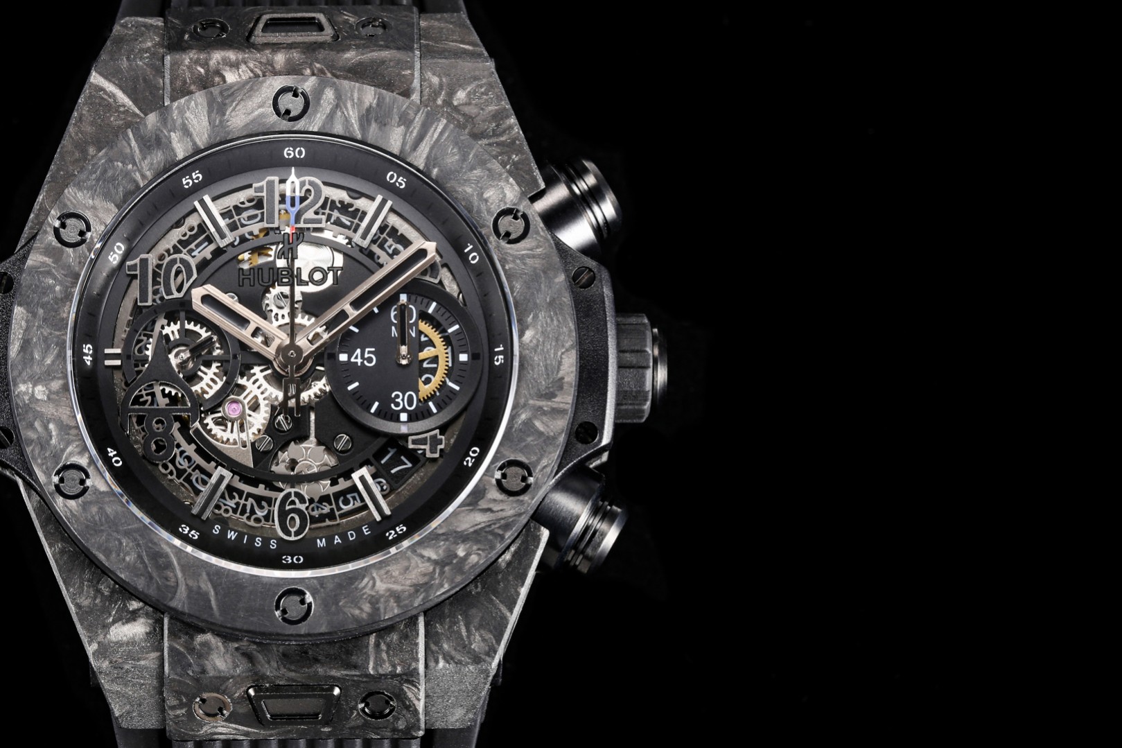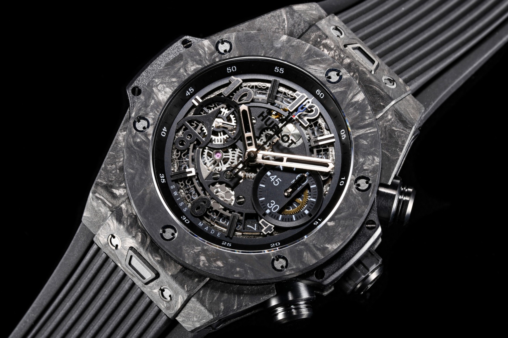 The Hublot Big Bang Carbon Fiber Watch features the remarkable HUB1242 movement, which is visible through the transparent case, showcasing the beauty of its extraordinary mechanical construction.