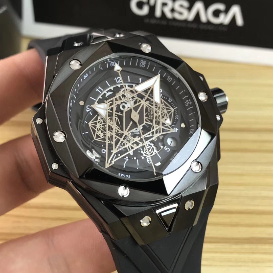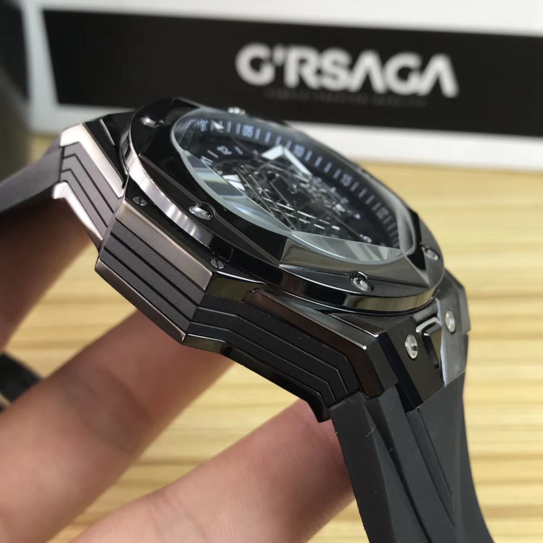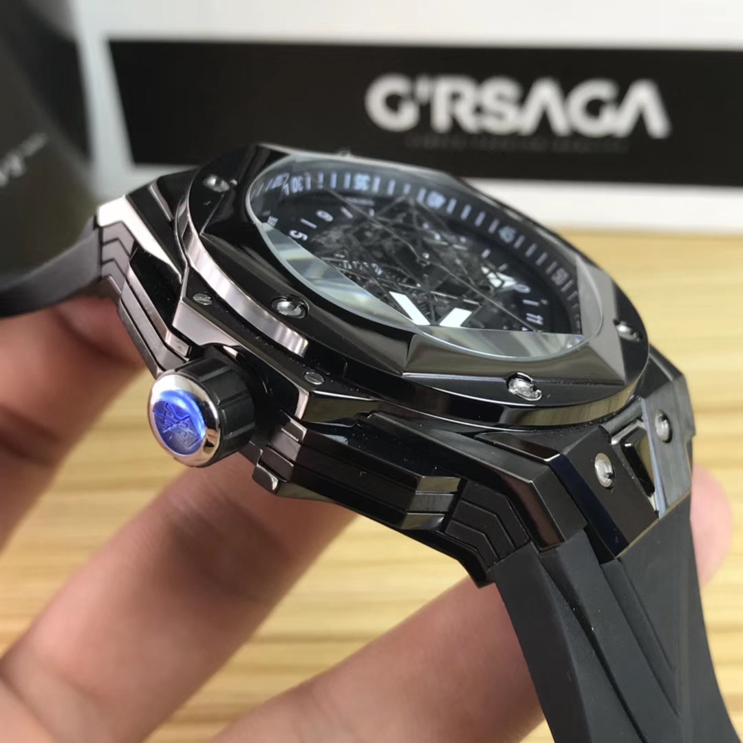 1. 45mm case diameter with graphic elements integrated into the hexagonal bezel through cutting and carving. The bezel is secured by 6 H-shaped titanium screws. The lugs of the watch have a strong design sense with steep angles and bold lines.