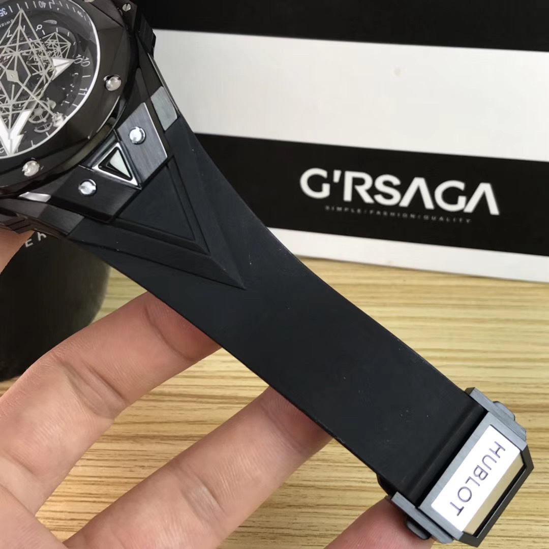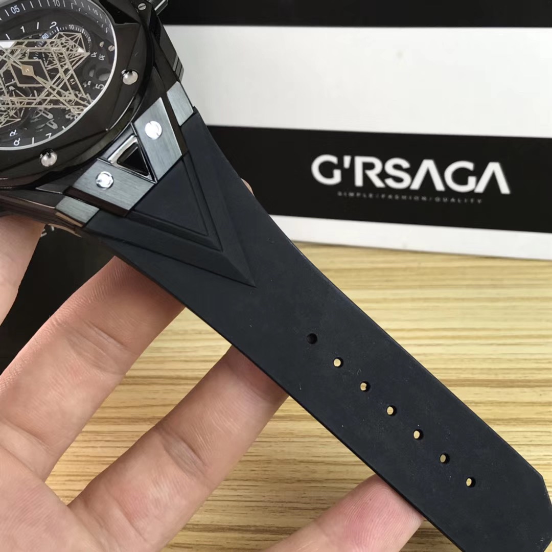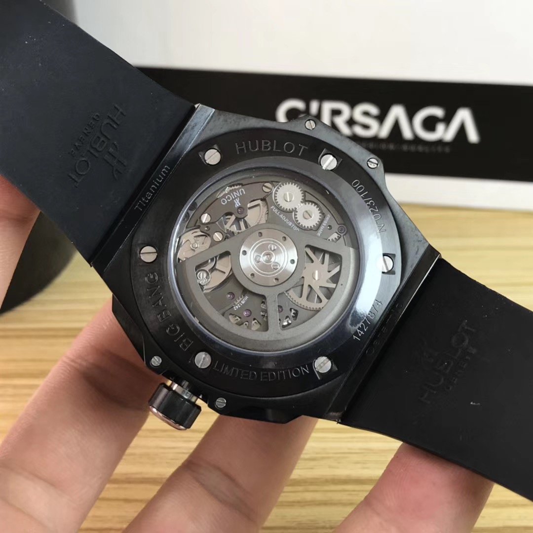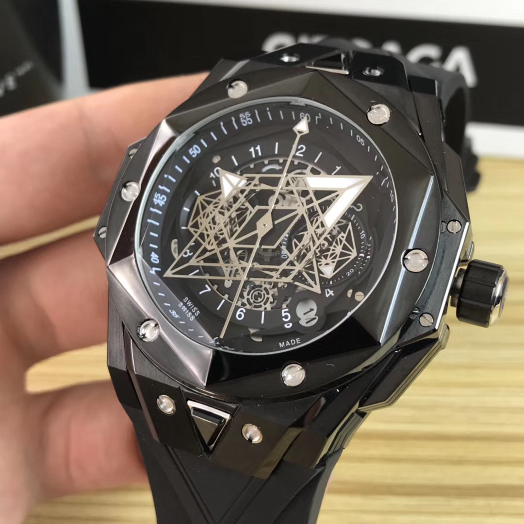 1. 45mm case diameter with graphic elements integrated into the hexagonal bezel through cutting and carving. The bezel is secured by 6 H-shaped titanium screws. The lugs of the watch have a strong design sense with steep angles and bold lines.