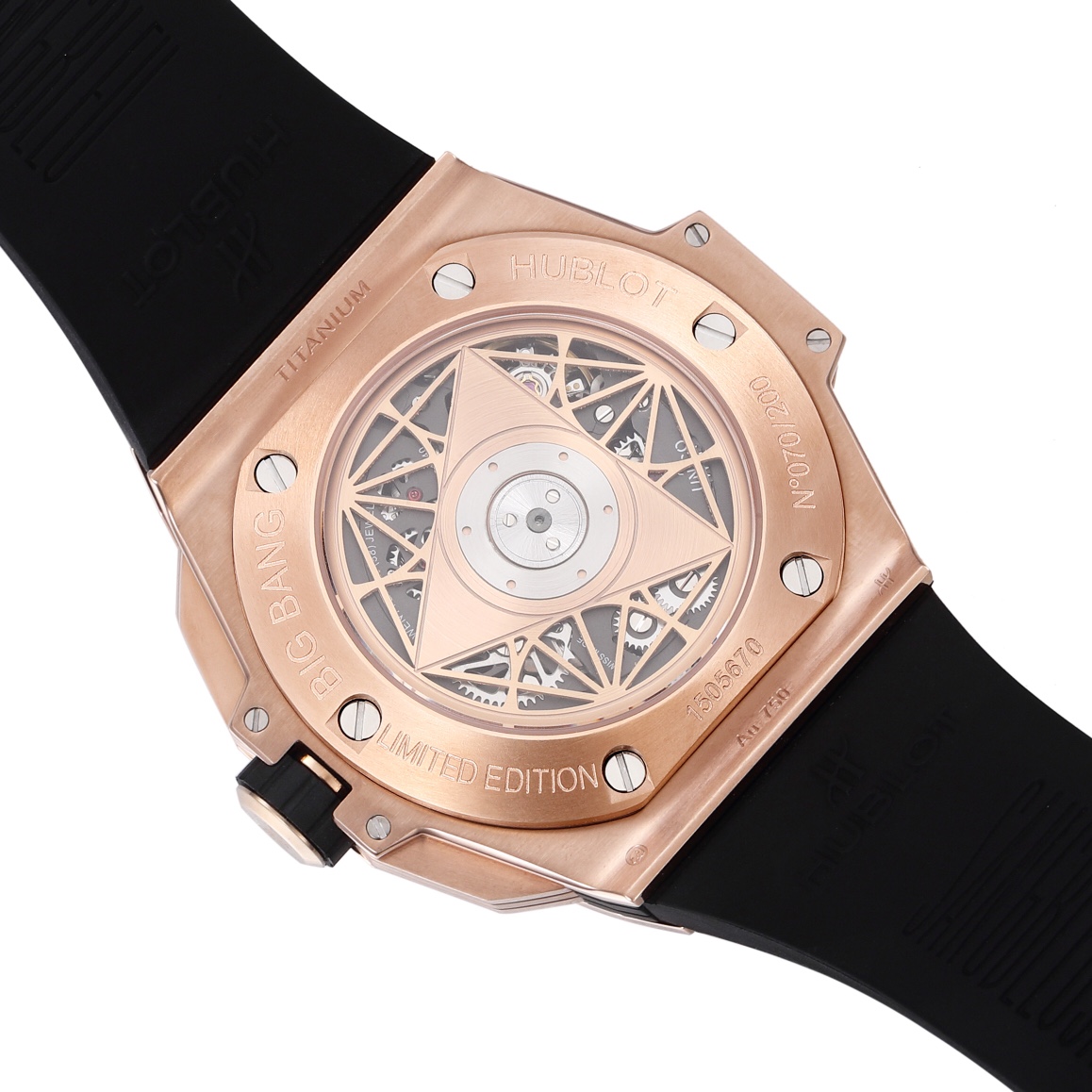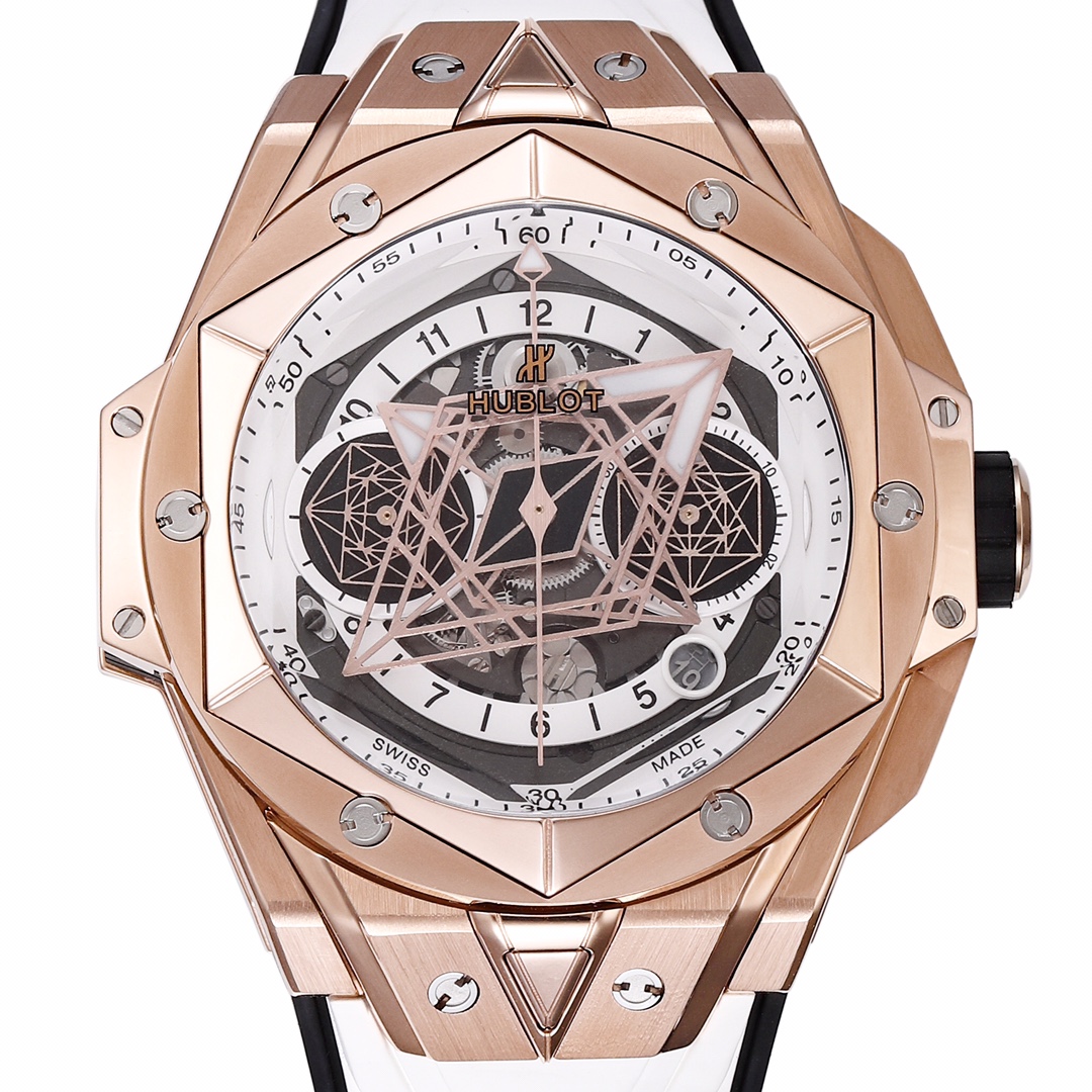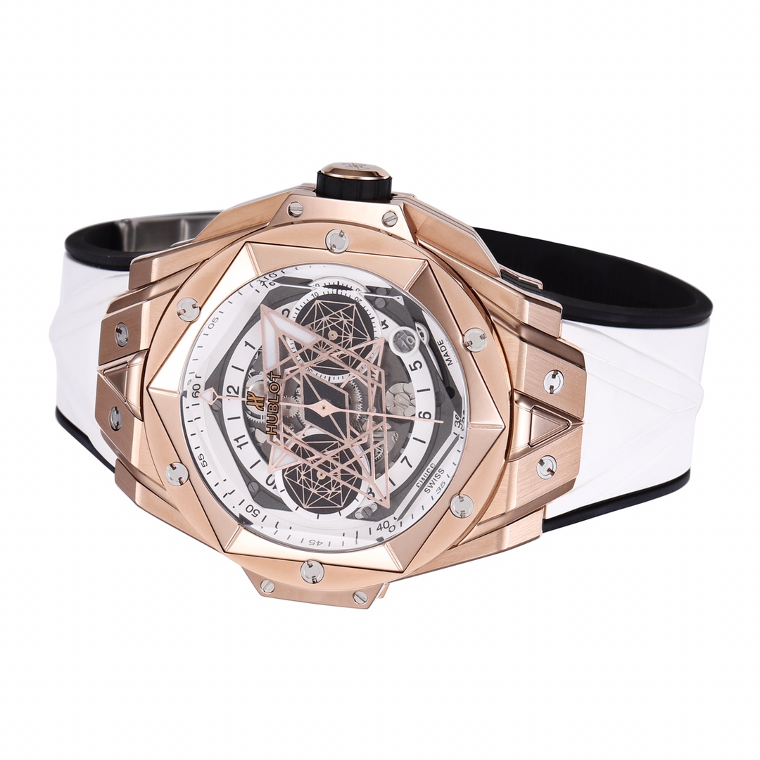 1. 45mm case diameter with graphic elements integrated into the hexagonal bezel through cutting and carving. The bezel is secured by 6 H-shaped titanium screws. The lugs of the watch have a strong design sense with steep angles and bold lines.