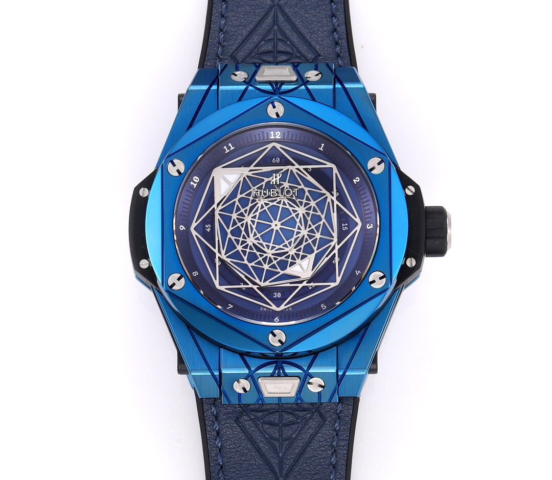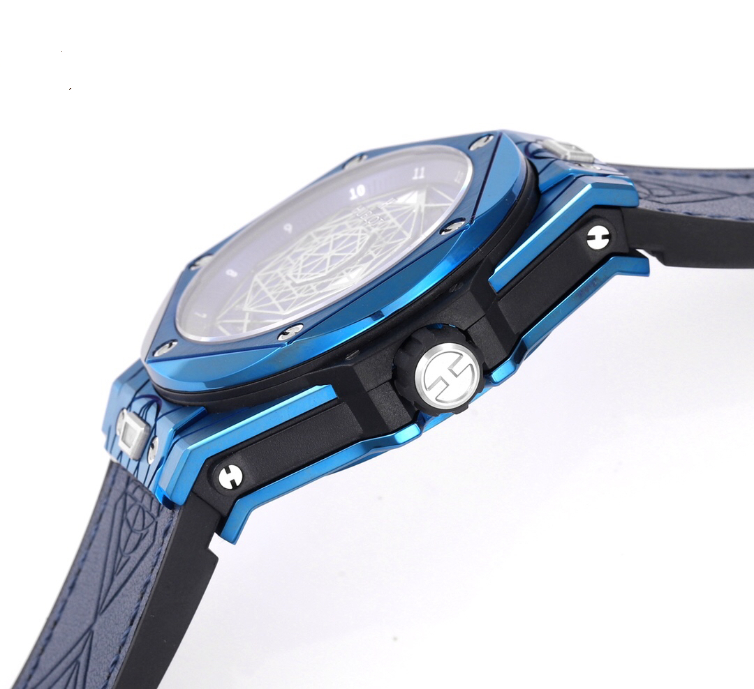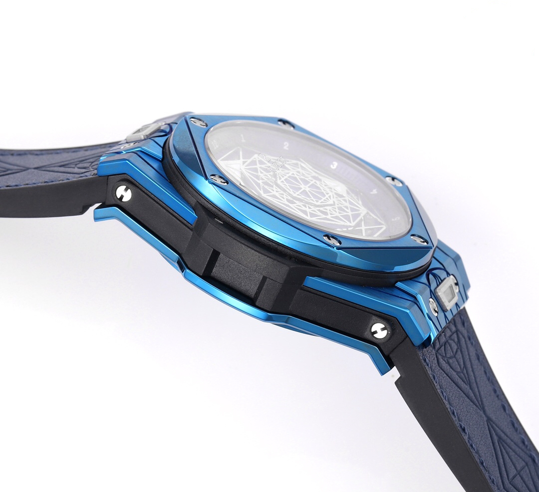 1. 45mm case diameter with graphic elements integrated into the hexagonal bezel through cutting and carving. The bezel is secured by 6 H-shaped titanium screws. The lugs of the watch have a strong design sense with steep angles and bold lines.