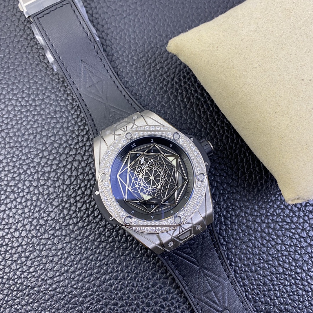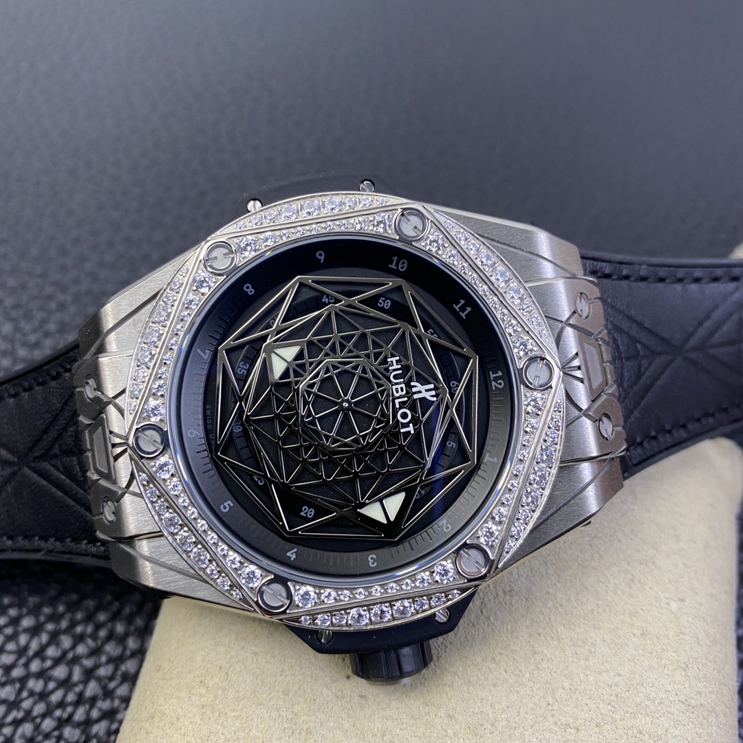 1. 45mm case diameter with graphic elements integrated into the hexagonal bezel through cutting and carving. The bezel is secured by 6 H-shaped titanium screws. The lugs of the watch have a strong design sense with steep angles and bold lines.