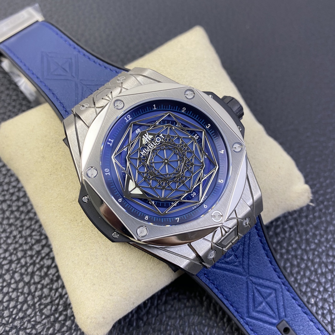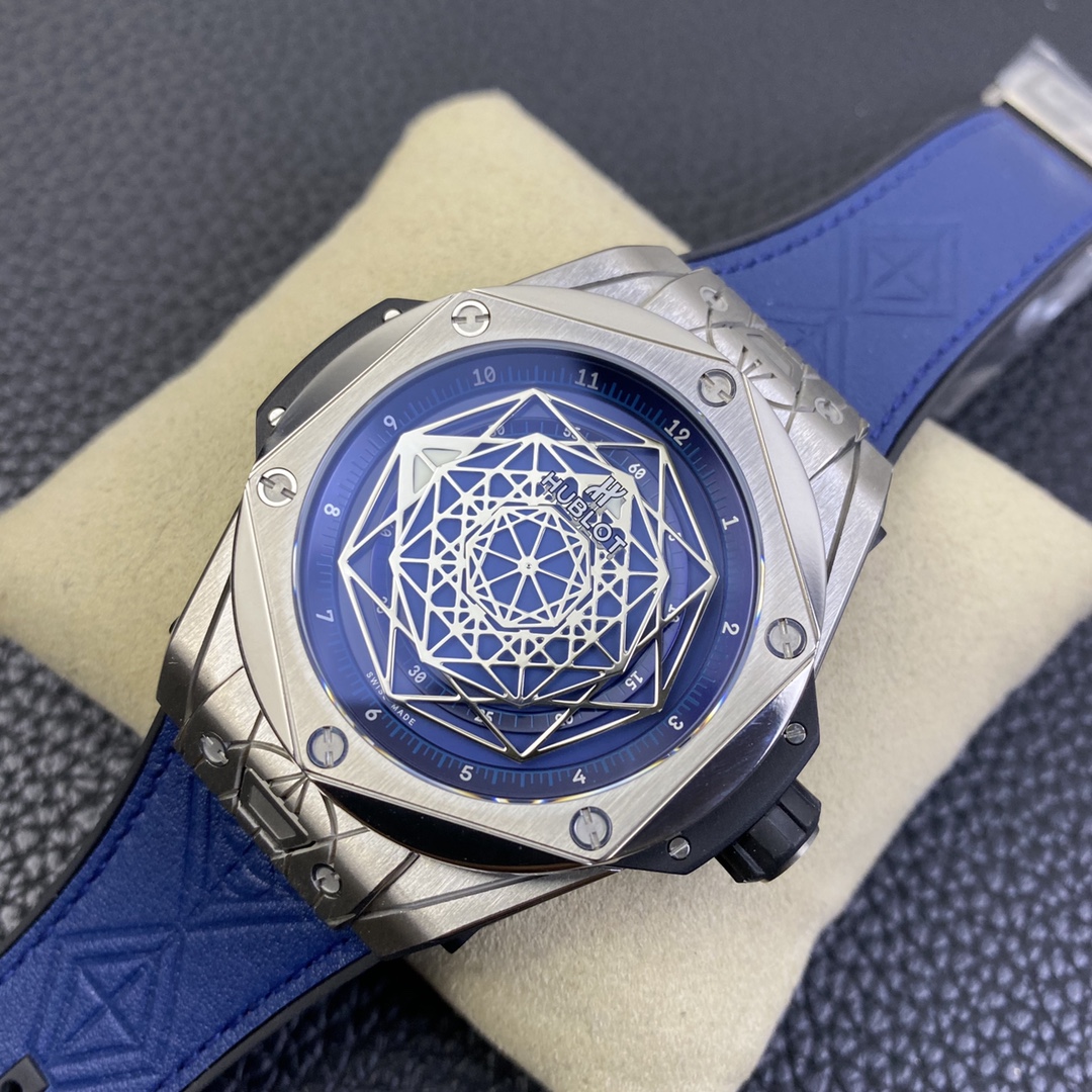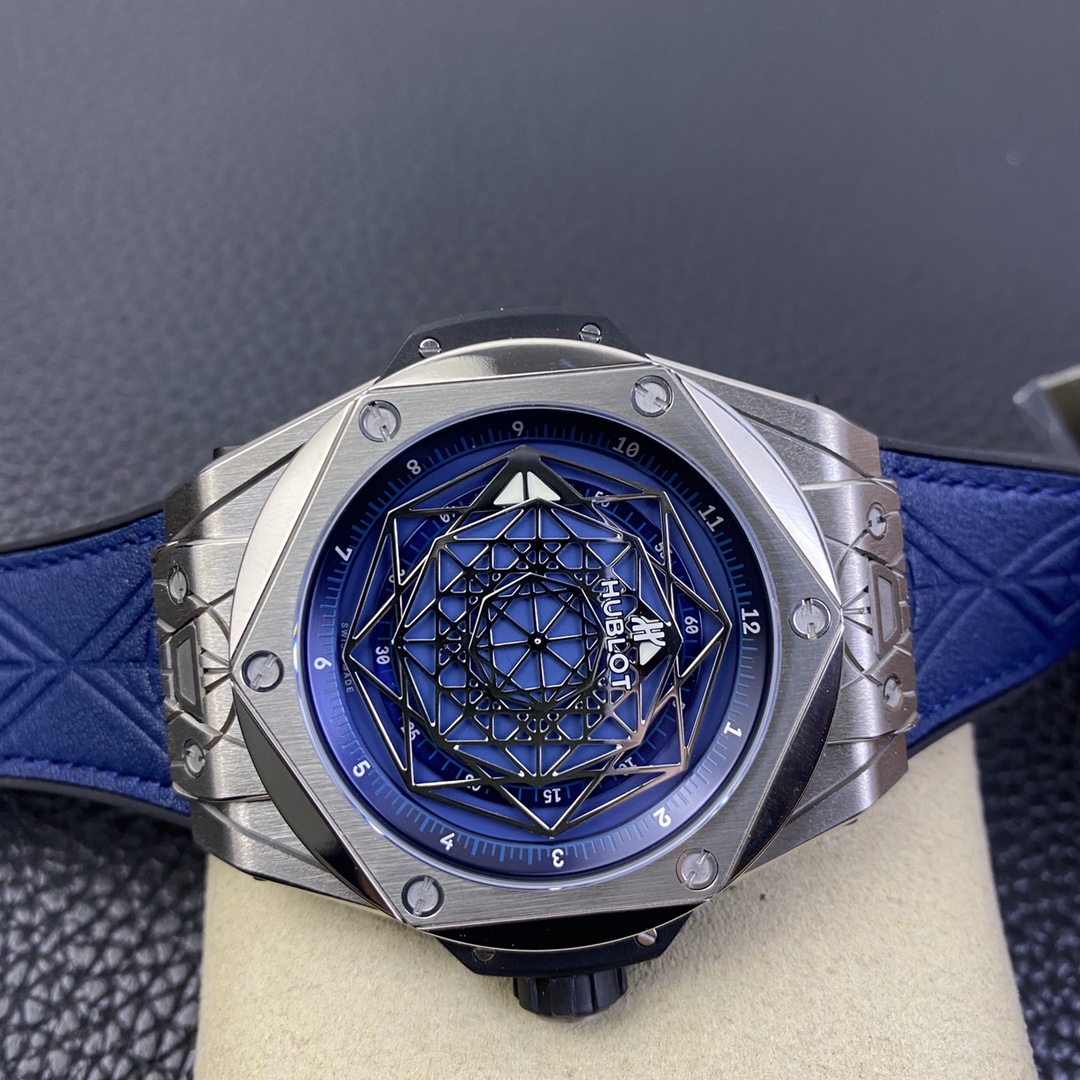 1. 45mm case diameter with graphic elements integrated into the hexagonal bezel through cutting and carving. The bezel is secured by 6 H-shaped titanium screws. The lugs of the watch have a strong design sense with steep angles and bold lines.
