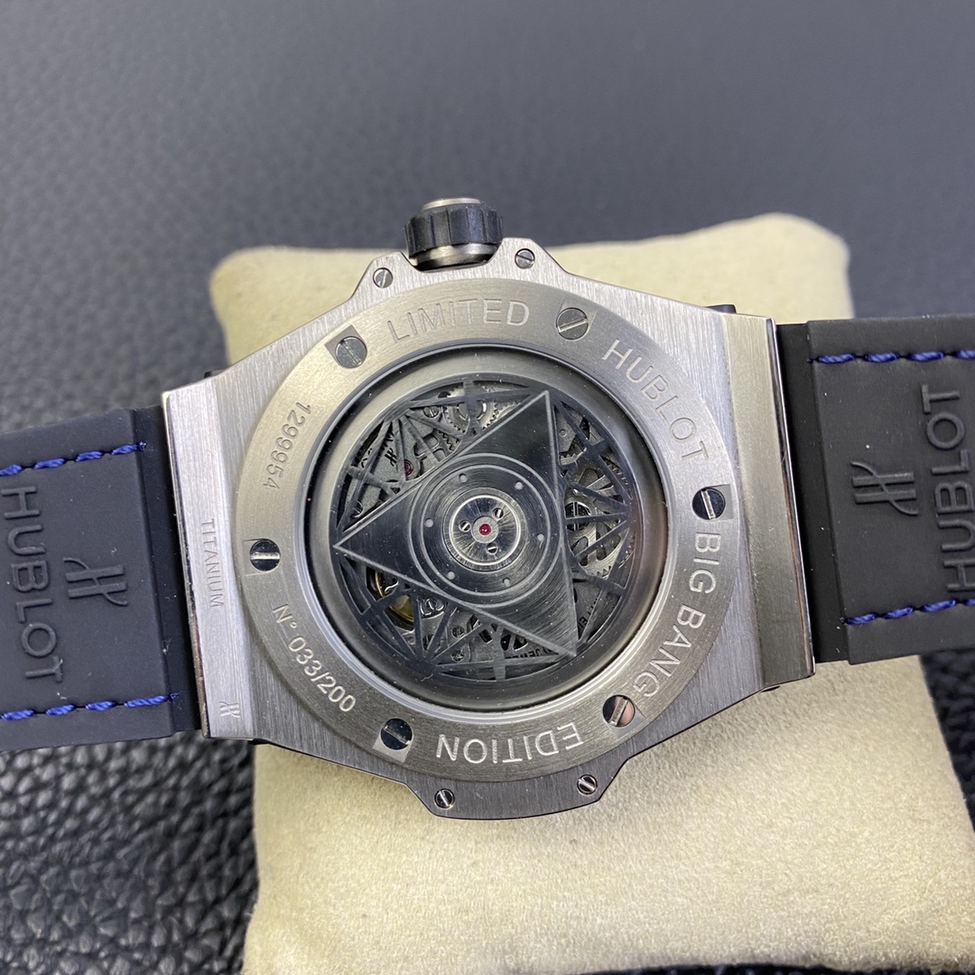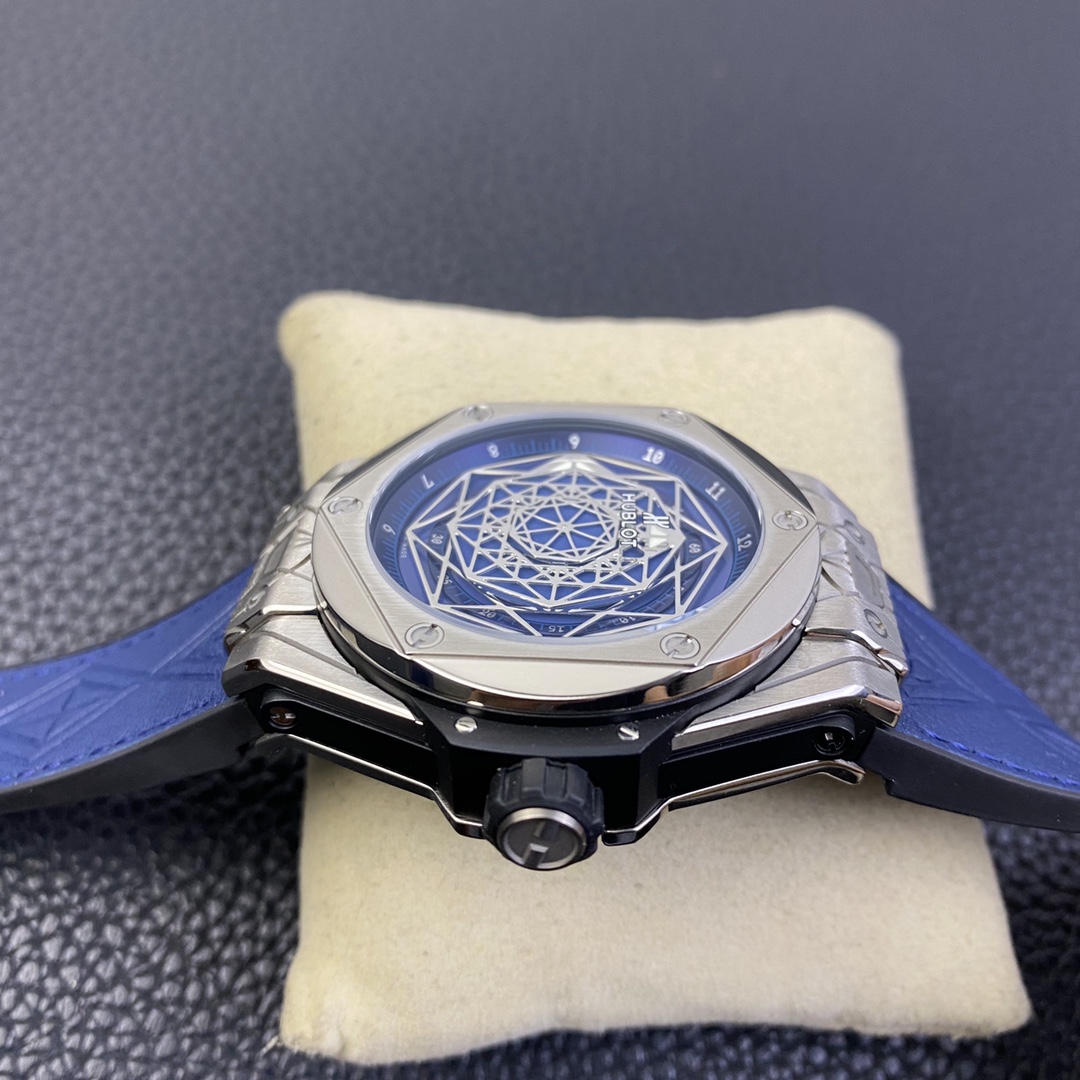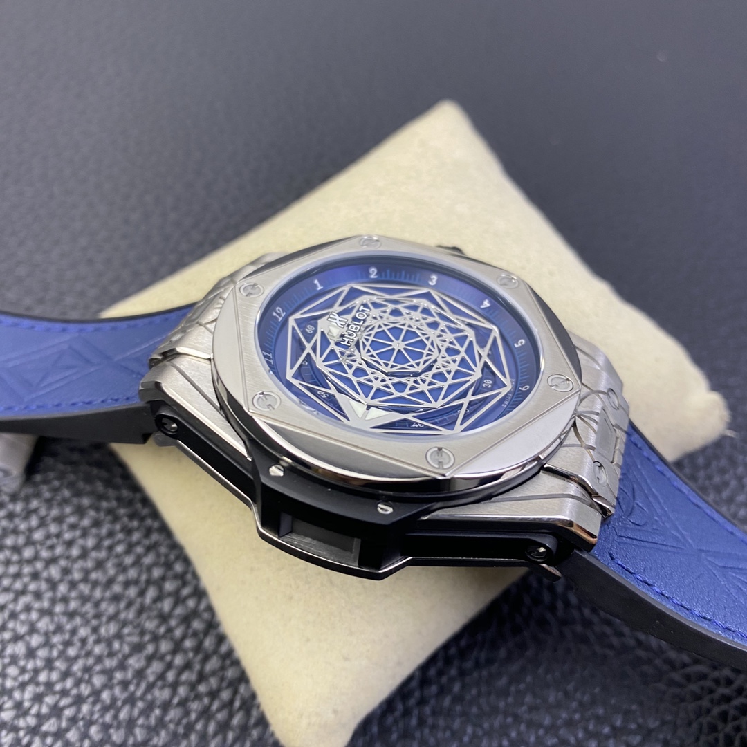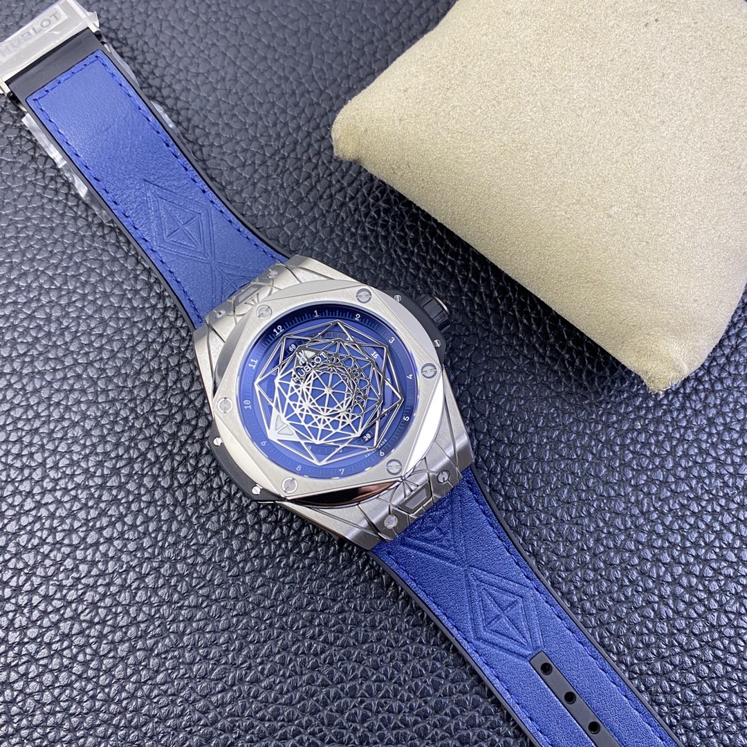 1. 45mm case diameter with graphic elements integrated into the hexagonal bezel through cutting and carving. The bezel is secured by 6 H-shaped titanium screws. The lugs of the watch have a strong design sense with steep angles and bold lines.
