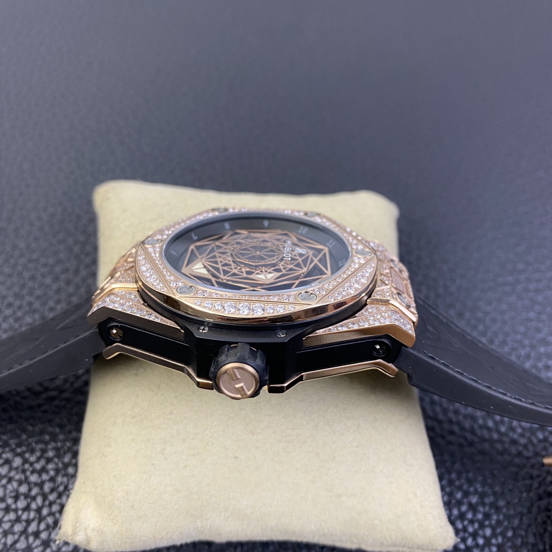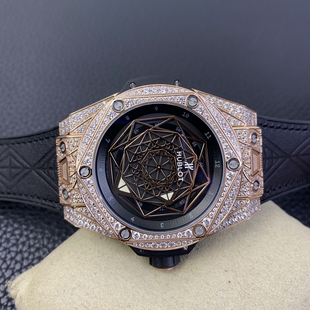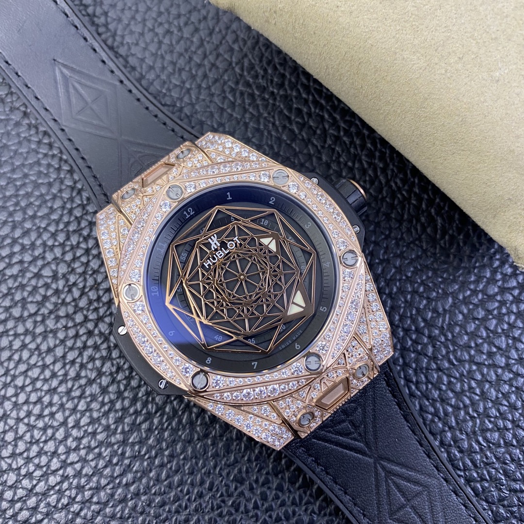 1. 45mm case diameter with graphic elements integrated into the hexagonal bezel through cutting and carving. The bezel is secured by 6 H-shaped titanium screws. The lugs of the watch have a strong design sense with steep angles and bold lines.