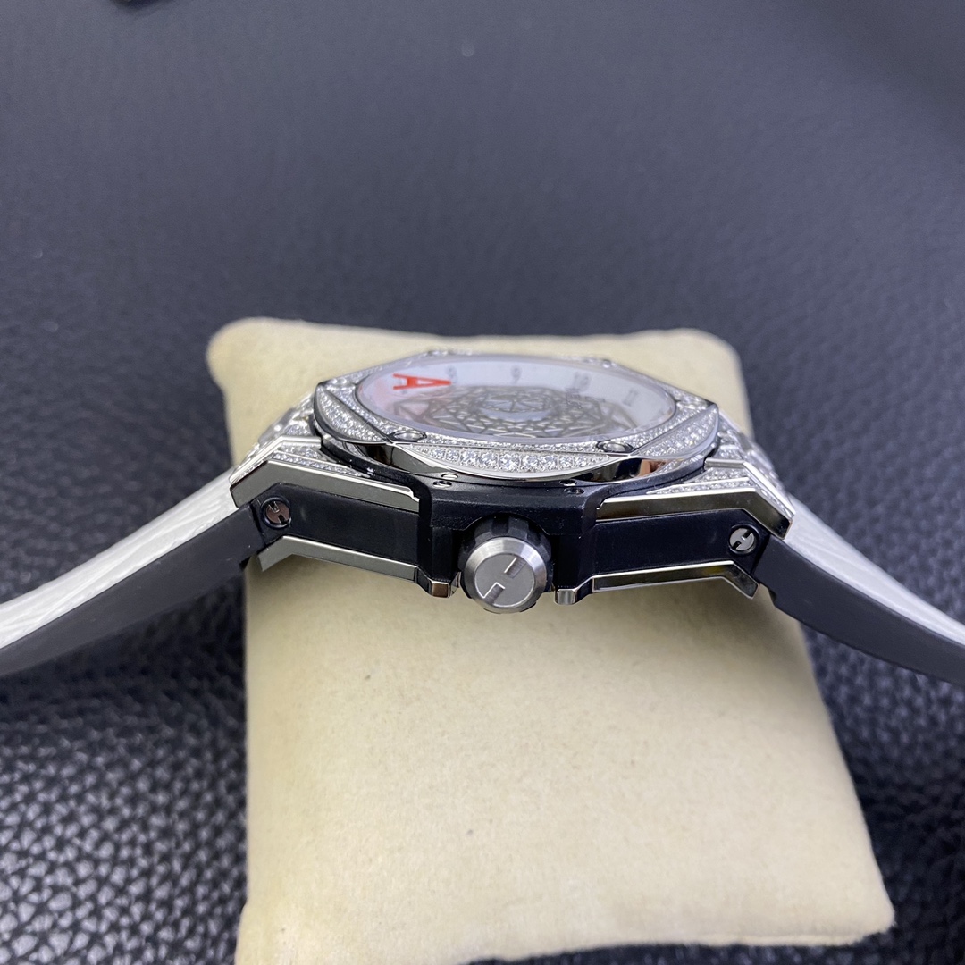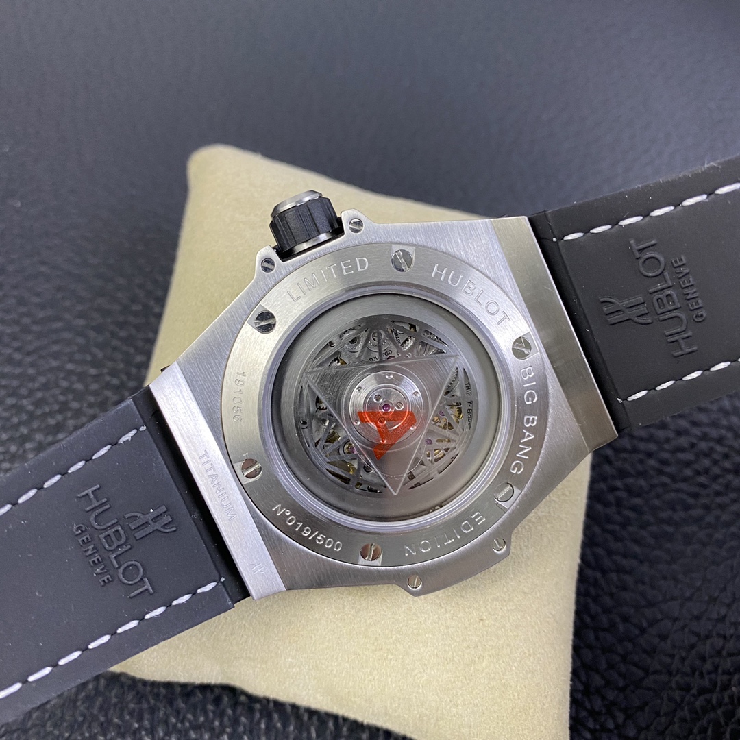 1. 45mm case diameter with graphic elements integrated into the hexagonal bezel through cutting and carving. The bezel is secured by 6 H-shaped titanium screws. The lugs of the watch have a strong design sense with steep angles and bold lines.