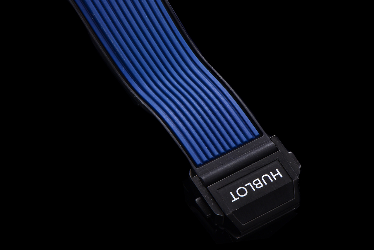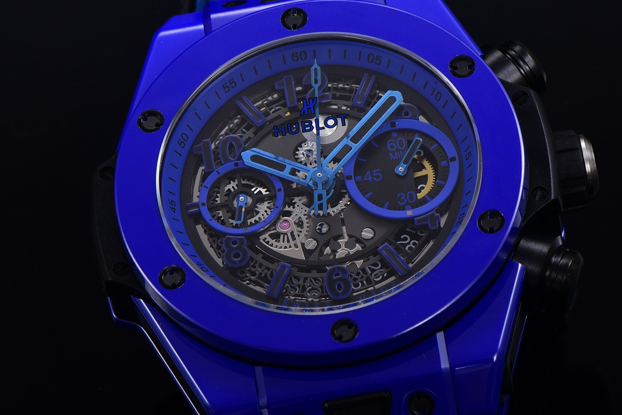 Exclusive UNICO HUB 1280 automatic flyback chronograph movement with a 3-subdial skeletonized date ring, a 3-subdial 60-minute chronograph, an 8-subdial horizontal clutch, a 9-subdial small seconds hand, sapphire crystal glass, a rubber strap with a ceramic folding clasp, colorful patterned hands, and a diameter of 45mm.