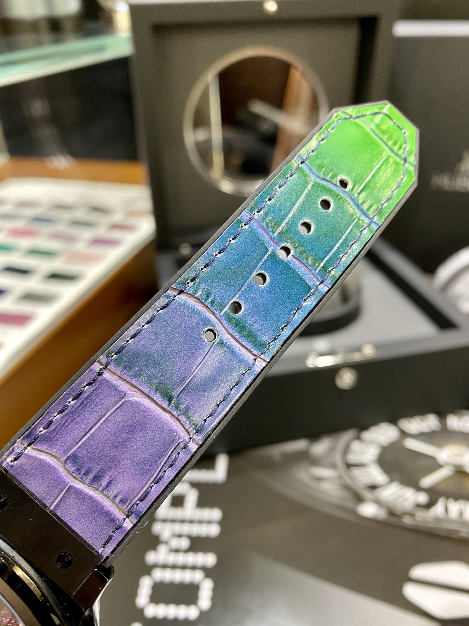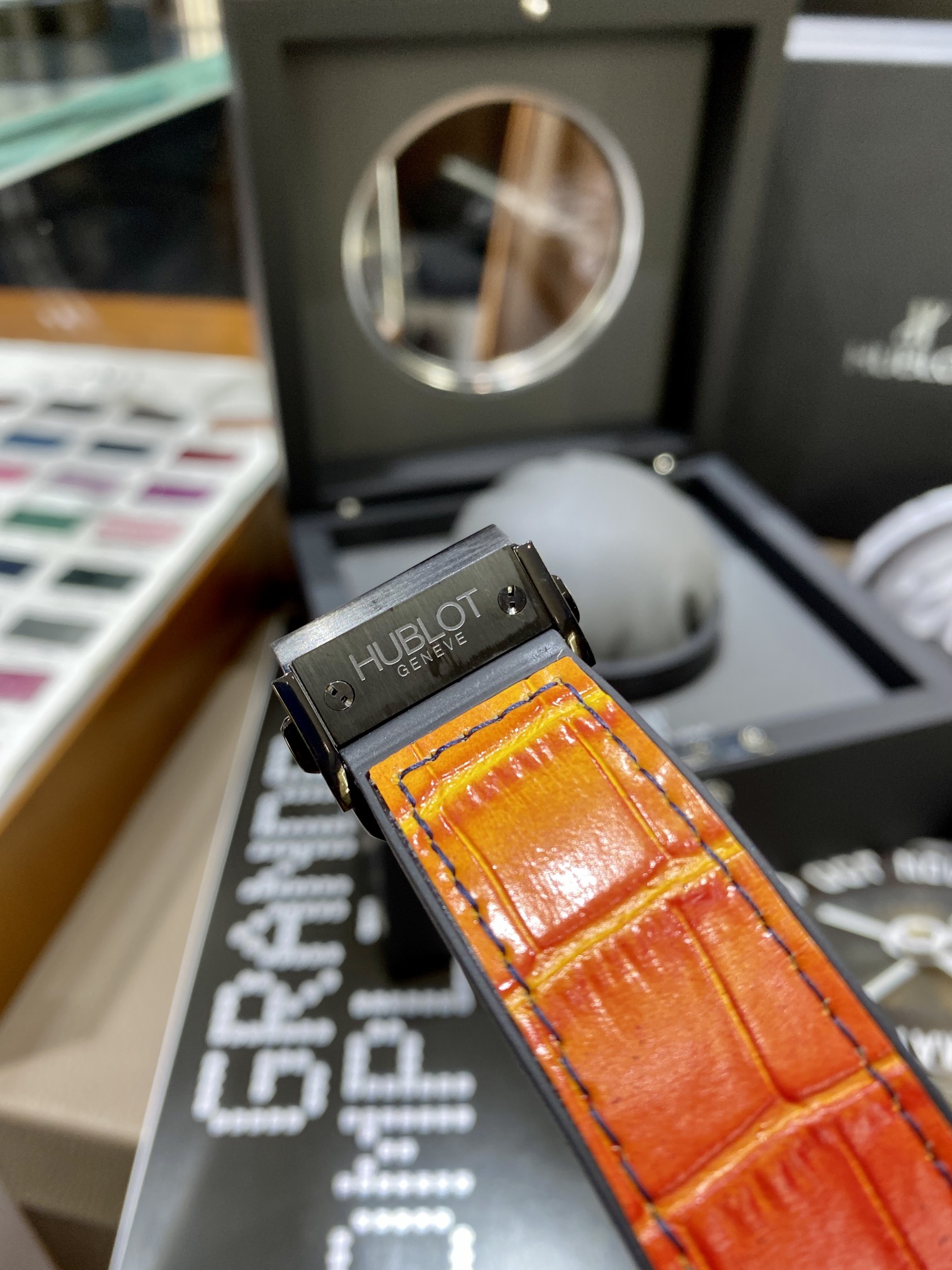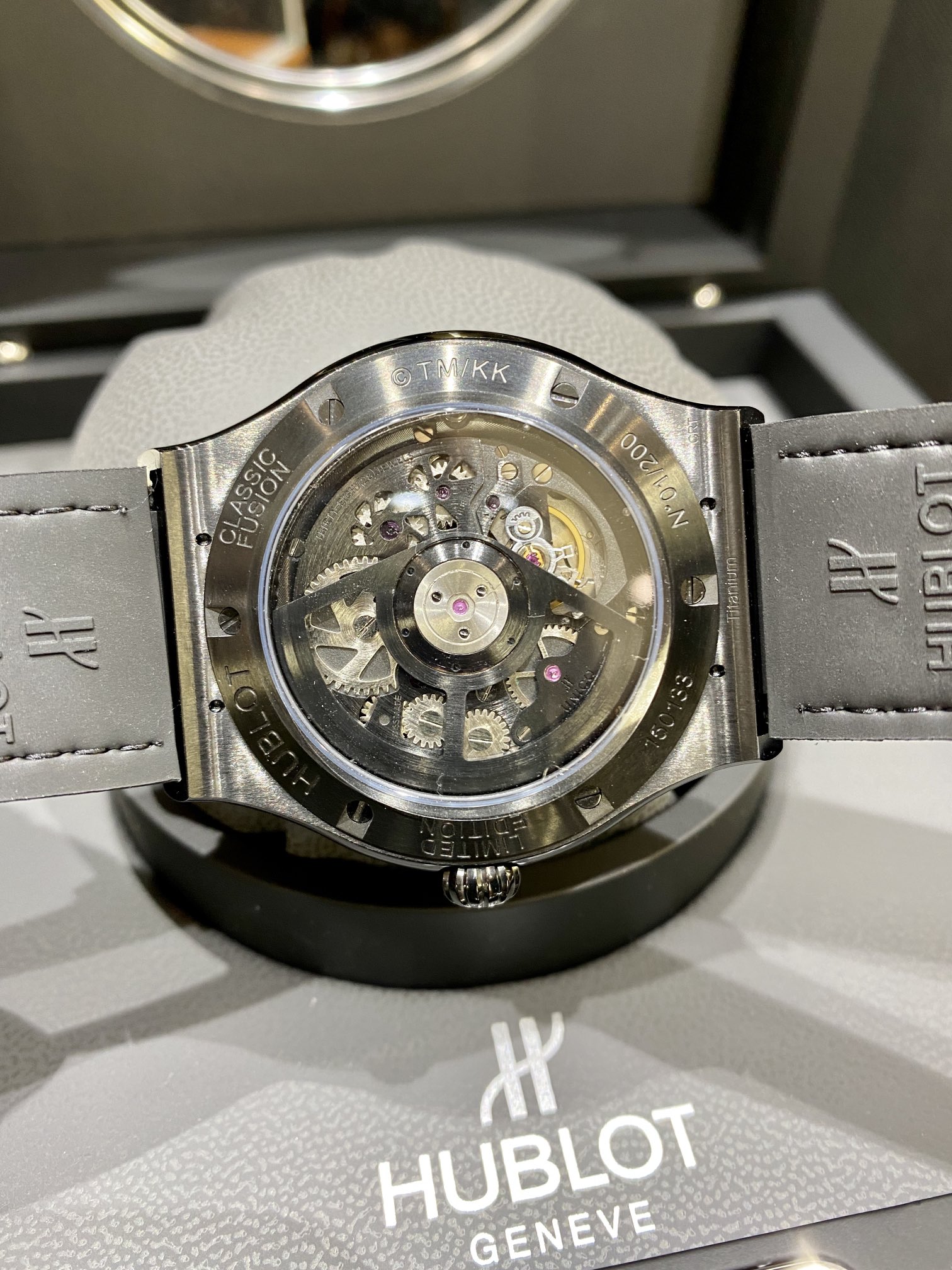 Movement: MHUB1214 UNICO complex self-winding movement, smoked ruthenium-plated bridges and mainplate, smoked coating on the oscillating weight, tungsten oscillating weight, surface finishes with micro-blasting and satin-finish, Swiss lever escapement with silicon lever, 256 components, 30 jewels, 4Hz frequency (28,800 vibrations per hour), 72-hour power reserve