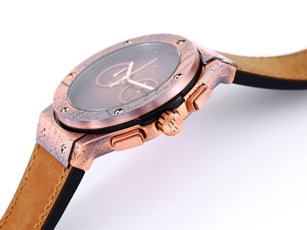 The watch features a carved design on the case using 316L stainless steel combined with layers of titanium, carbon, and copper through a direct electroplating process. It is equipped with an imported quartz movement for accurate timekeeping.