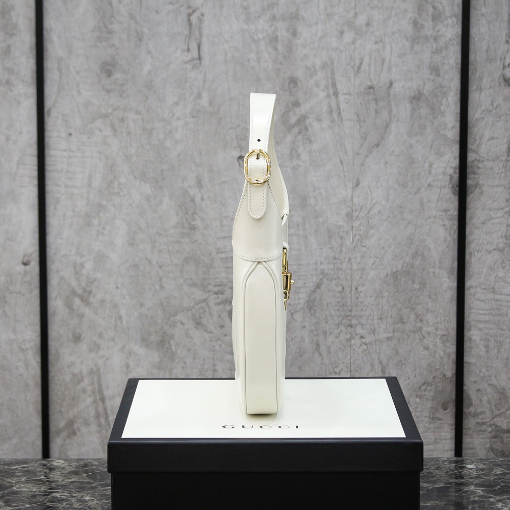 The reintroduction of the Jackie bag for Fall Winter 2020 presents a new take on a historical Gucci icon. Brought back to the forefront, the recognizable shape is presented in white leather and enhanced with an additional, detachable shoulder strap. Attached to the bag with a buckle closure, the second strap adds a contemporary feel to the archival style, providing new ways to wear—from top handle, shoulder to cross body.